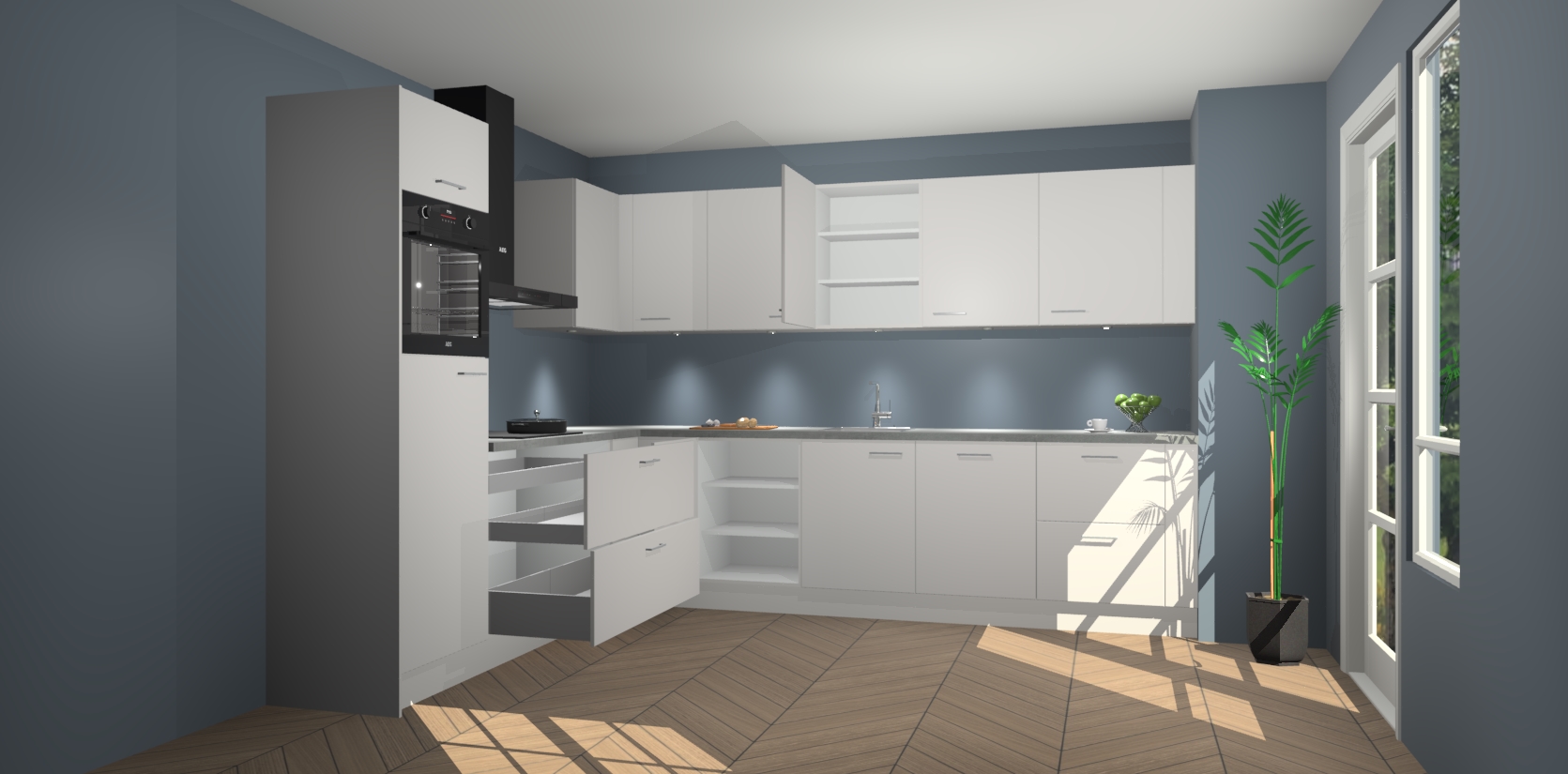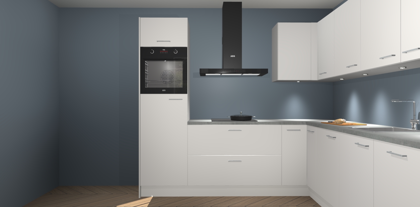 De Zijdegrijze keuken Debar is uitgerust met vijf inbouwapparaten die elke kooktaak handig en efficiënt maken. Een oven, inductiekookplaat, afzuigkap, vaatwasser en koelkast zijn standaard, maar kunnen na bestelling eenvoudig worden geupgrade naar AEG. Profiteer vervolgens van de softclose deuren voor snelle toegang en geruisloze toegang.