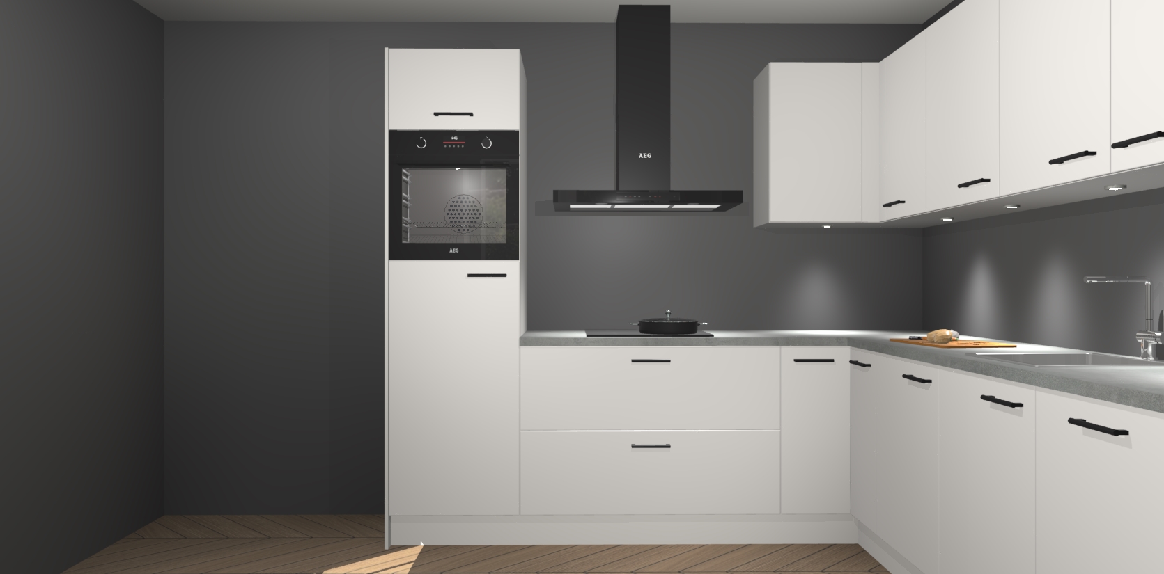 De Zijdegrijze keuken Debar is uitgerust met vijf inbouwapparaten die elke kooktaak handig en efficiënt maken. Een oven, inductiekookplaat, afzuigkap, vaatwasser en koelkast zijn standaard, maar kunnen na bestelling eenvoudig worden geupgrade naar AEG. Profiteer vervolgens van de softclose deuren voor snelle toegang en geruisloze toegang.