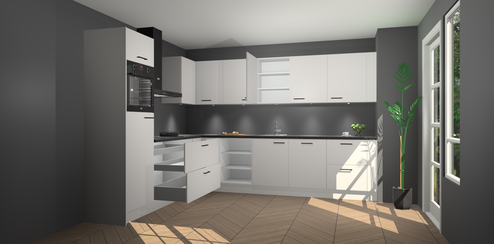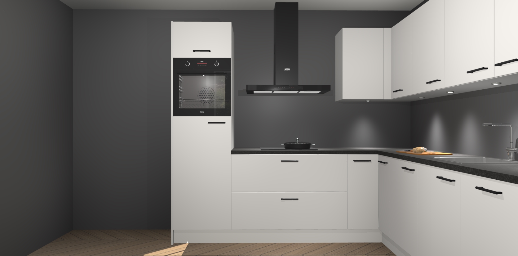 De Zijdegrijze keuken Debar is uitgerust met vijf inbouwapparaten die elke kooktaak handig en efficiënt maken. Een oven, inductiekookplaat, afzuigkap, vaatwasser en koelkast zijn standaard, maar kunnen na bestelling eenvoudig worden geupgrade naar AEG. Profiteer vervolgens van de softclose deuren voor snelle toegang en geruisloze toegang.