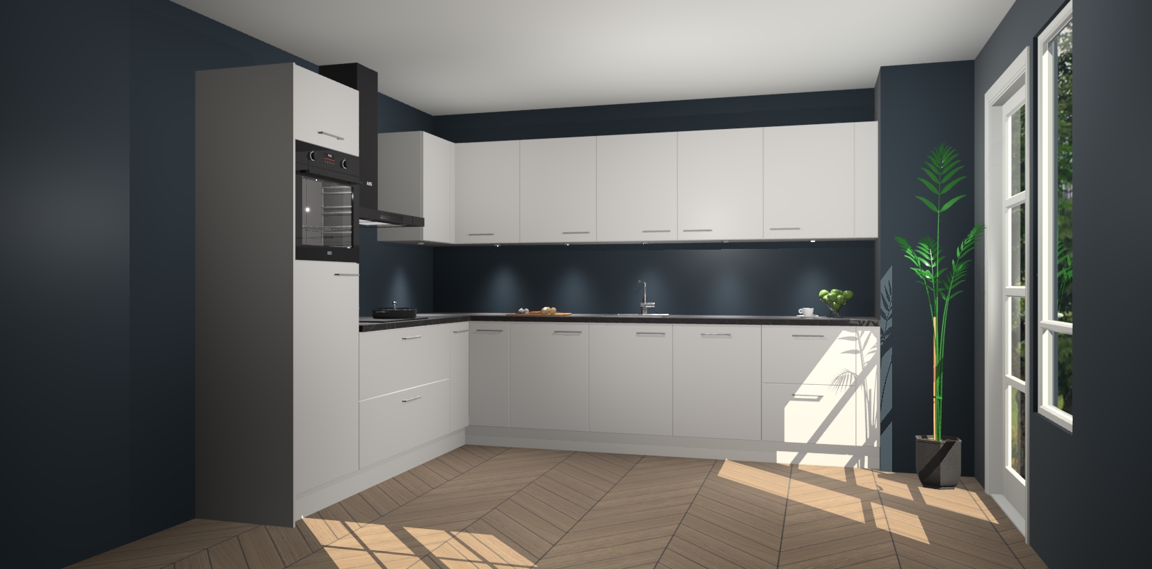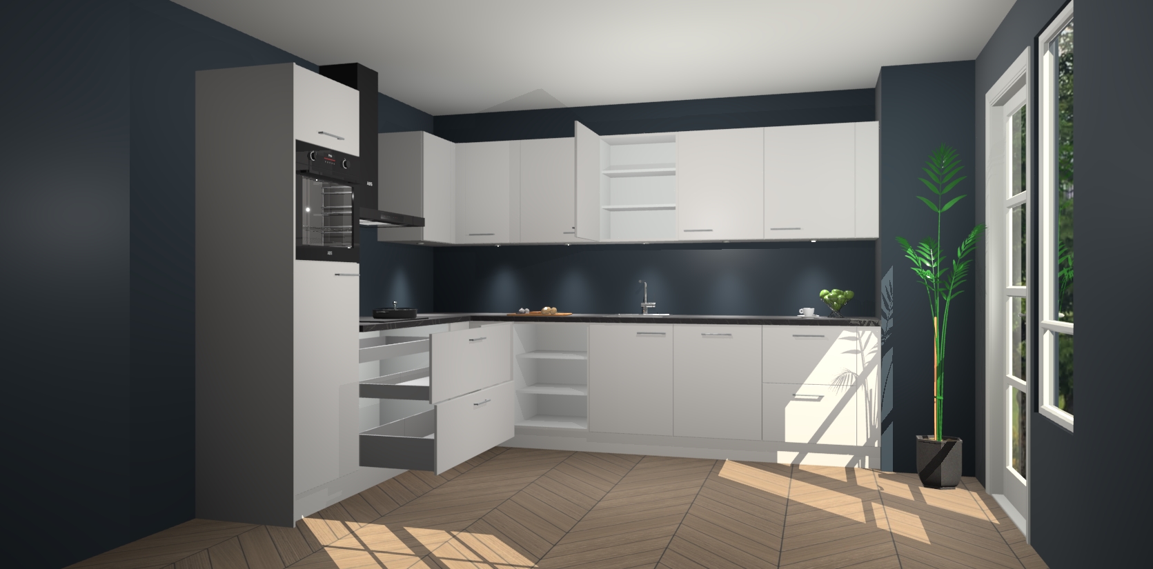 De Zijdegrijze keuken Debar is uitgerust met vijf inbouwapparaten die elke kooktaak handig en efficiënt maken. Een oven, inductiekookplaat, afzuigkap, vaatwasser en koelkast zijn standaard, maar kunnen na bestelling eenvoudig worden geupgrade naar AEG. Profiteer vervolgens van de softclose deuren voor snelle toegang en geruisloze toegang.