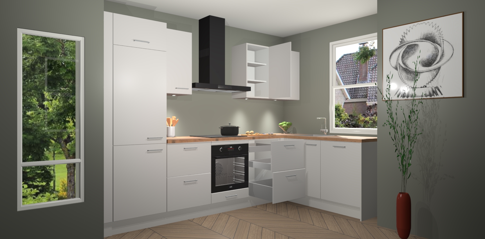 In deze box zijn alle kleuren verzameld van de deuren en werkbladen. Vraag de gratis kleurenbox aan en kijk thuis rustig verder!