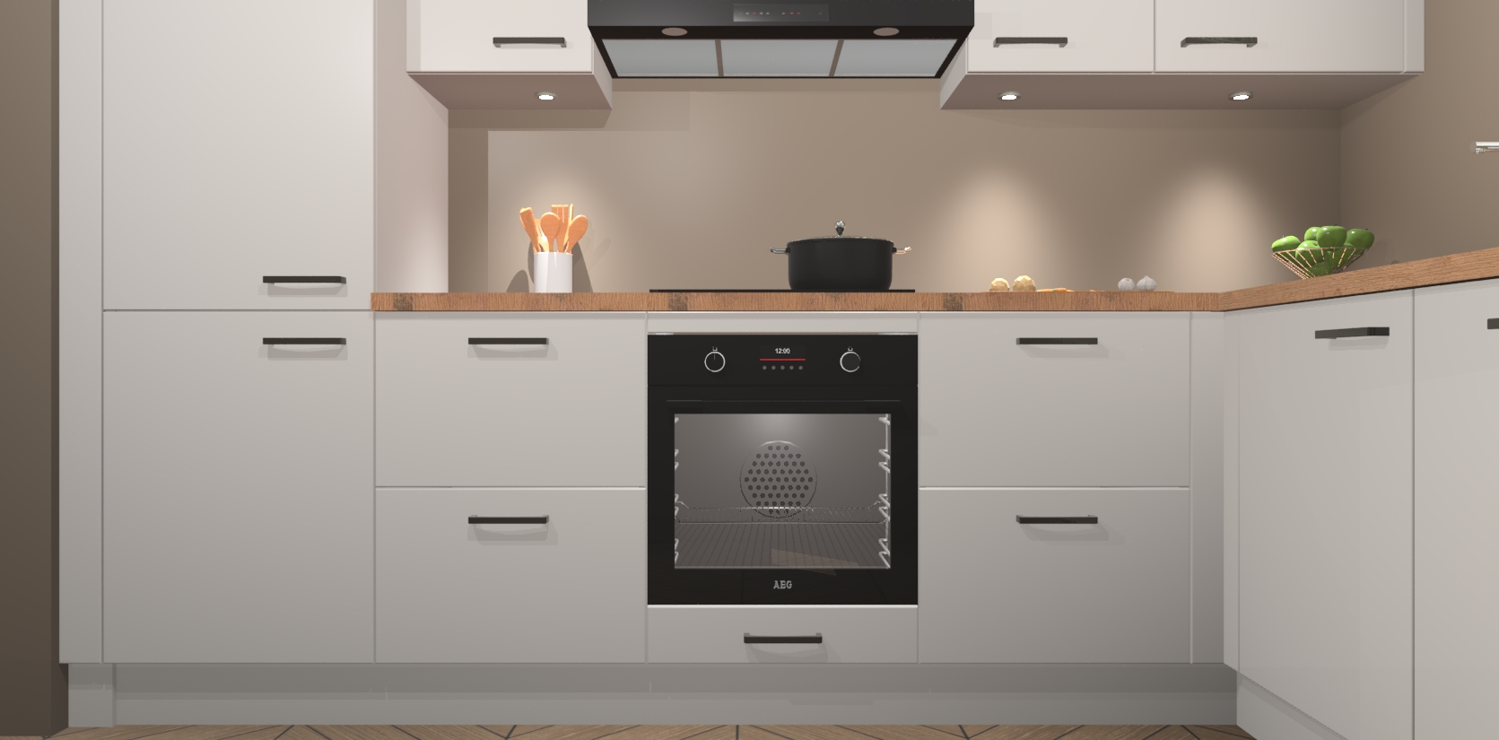 De Zijdegrijze keuken Geneve is uitgerust met 5 inbouwapparaten - een oven, inductiekookplaat, afzuigkap, vaatwasser en koelkast - voor al uw kook- en bewaarbehoeftes. U kunt deze apparaten desgewenst eenvoudig upgraden naar AEG of de oven omruilen voor een combimagnetron na het plaatsen van uw bestelling. En met de soft close deuren, voldoende opbergruimte en kasten die voorgemonteerd worden geleverd, bent u in een mum van tijd klaar om heerlijke maaltijden te bereiden!