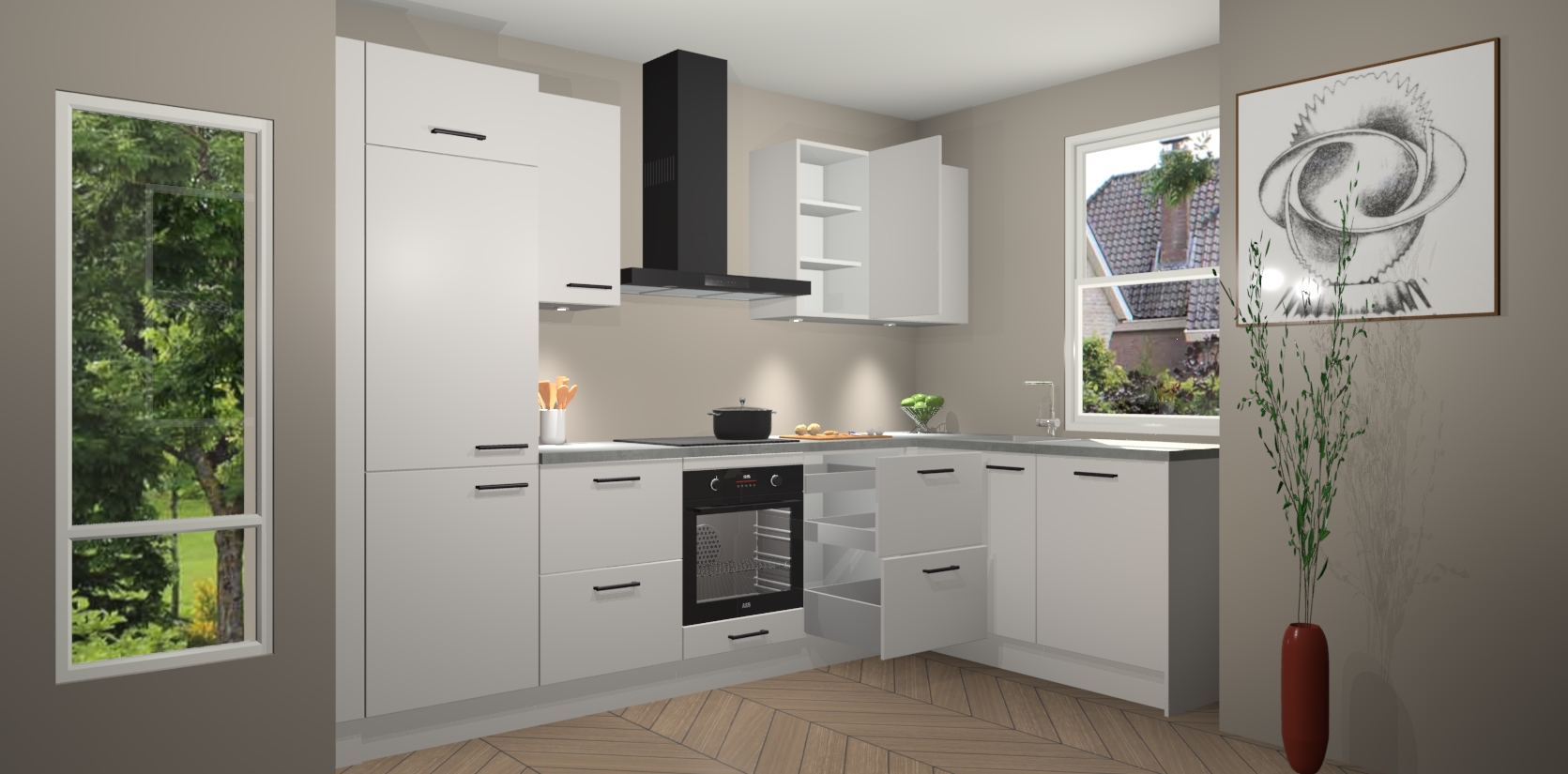 In deze box zijn alle kleuren verzameld van de deuren en werkbladen. Vraag de gratis kleurenbox aan en kijk thuis rustig verder!
