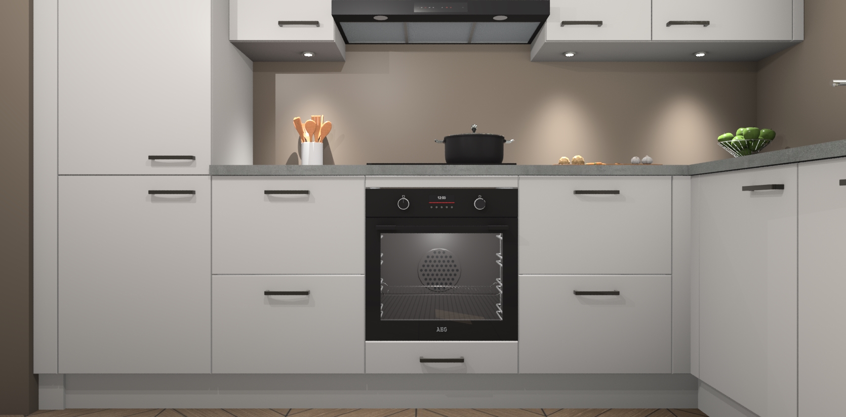 De Zijdegrijze keuken Geneve is uitgerust met 5 inbouwapparaten - een oven, inductiekookplaat, afzuigkap, vaatwasser en koelkast - voor al uw kook- en bewaarbehoeftes. U kunt deze apparaten desgewenst eenvoudig upgraden naar AEG of de oven omruilen voor een combimagnetron na het plaatsen van uw bestelling. En met de soft close deuren, voldoende opbergruimte en kasten die voorgemonteerd worden geleverd, bent u in een mum van tijd klaar om heerlijke maaltijden te bereiden!