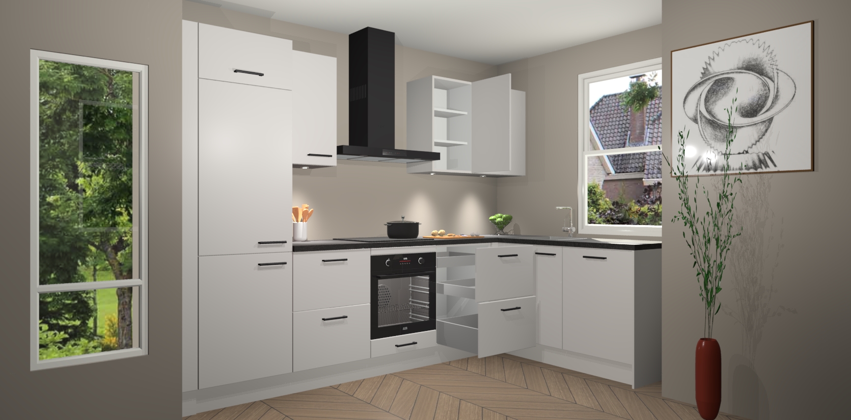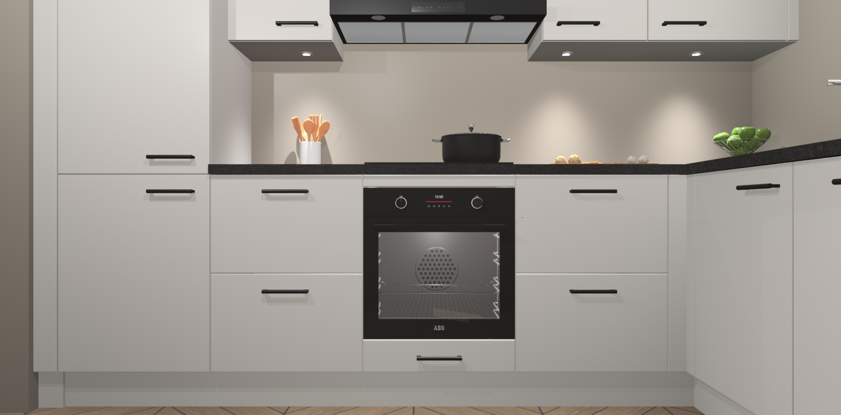 De Zijdegrijze keuken Geneve is uitgerust met 5 inbouwapparaten - een oven, inductiekookplaat, afzuigkap, vaatwasser en koelkast - voor al uw kook- en bewaarbehoeftes. U kunt deze apparaten desgewenst eenvoudig upgraden naar AEG of de oven omruilen voor een combimagnetron na het plaatsen van uw bestelling. En met de soft close deuren, voldoende opbergruimte en kasten die voorgemonteerd worden geleverd, bent u in een mum van tijd klaar om heerlijke maaltijden te bereiden!