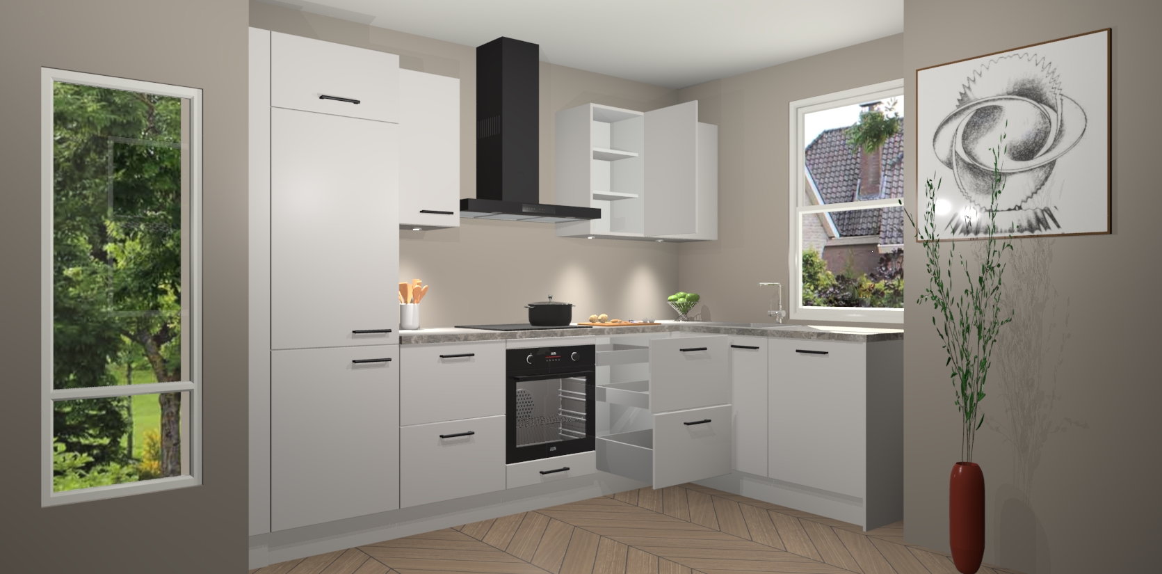 In deze box zijn alle kleuren verzameld van de deuren en werkbladen. Vraag de gratis kleurenbox aan en kijk thuis rustig verder!