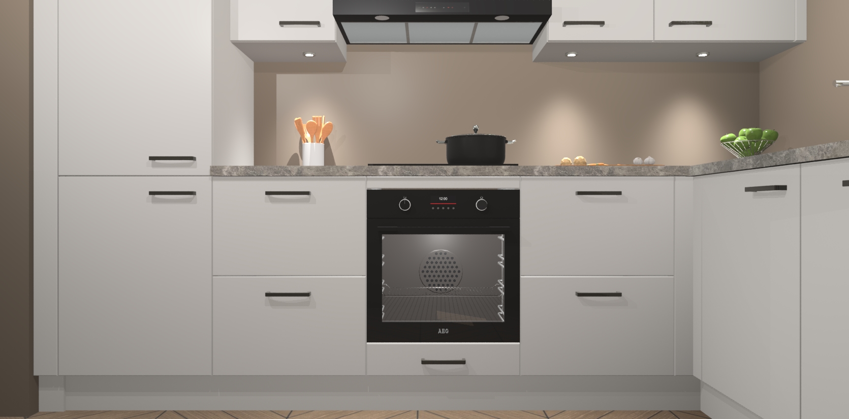 De Zijdegrijze keuken Geneve is uitgerust met 5 inbouwapparaten - een oven, inductiekookplaat, afzuigkap, vaatwasser en koelkast - voor al uw kook- en bewaarbehoeftes. U kunt deze apparaten desgewenst eenvoudig upgraden naar AEG of de oven omruilen voor een combimagnetron na het plaatsen van uw bestelling. En met de soft close deuren, voldoende opbergruimte en kasten die voorgemonteerd worden geleverd, bent u in een mum van tijd klaar om heerlijke maaltijden te bereiden!