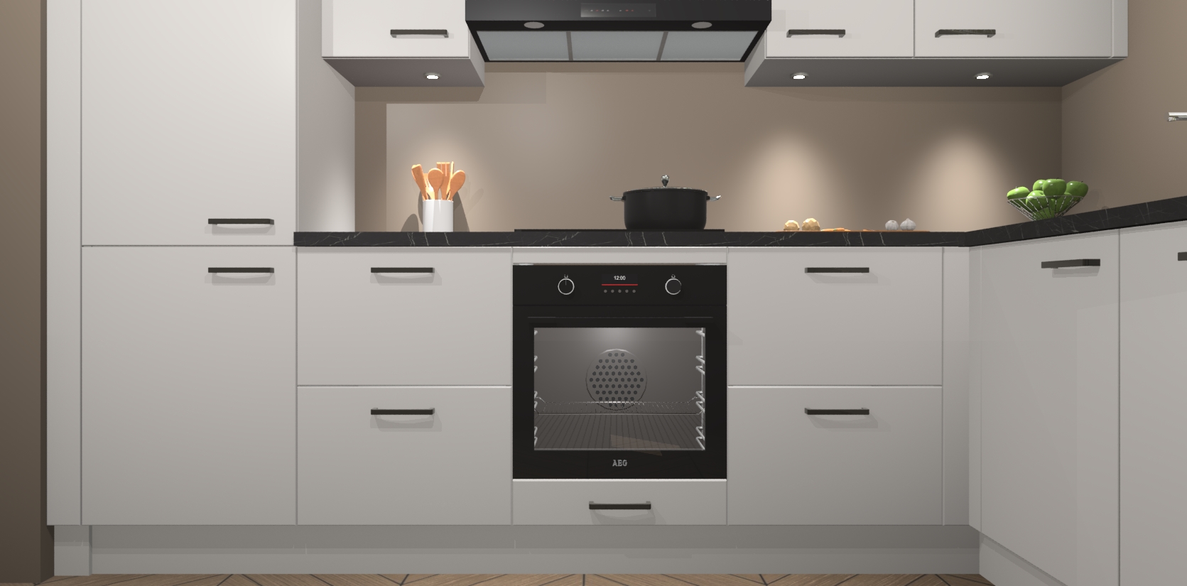 De Zijdegrijze keuken Geneve is uitgerust met 5 inbouwapparaten - een oven, inductiekookplaat, afzuigkap, vaatwasser en koelkast - voor al uw kook- en bewaarbehoeftes. U kunt deze apparaten desgewenst eenvoudig upgraden naar AEG of de oven omruilen voor een combimagnetron na het plaatsen van uw bestelling. En met de soft close deuren, voldoende opbergruimte en kasten die voorgemonteerd worden geleverd, bent u in een mum van tijd klaar om heerlijke maaltijden te bereiden!