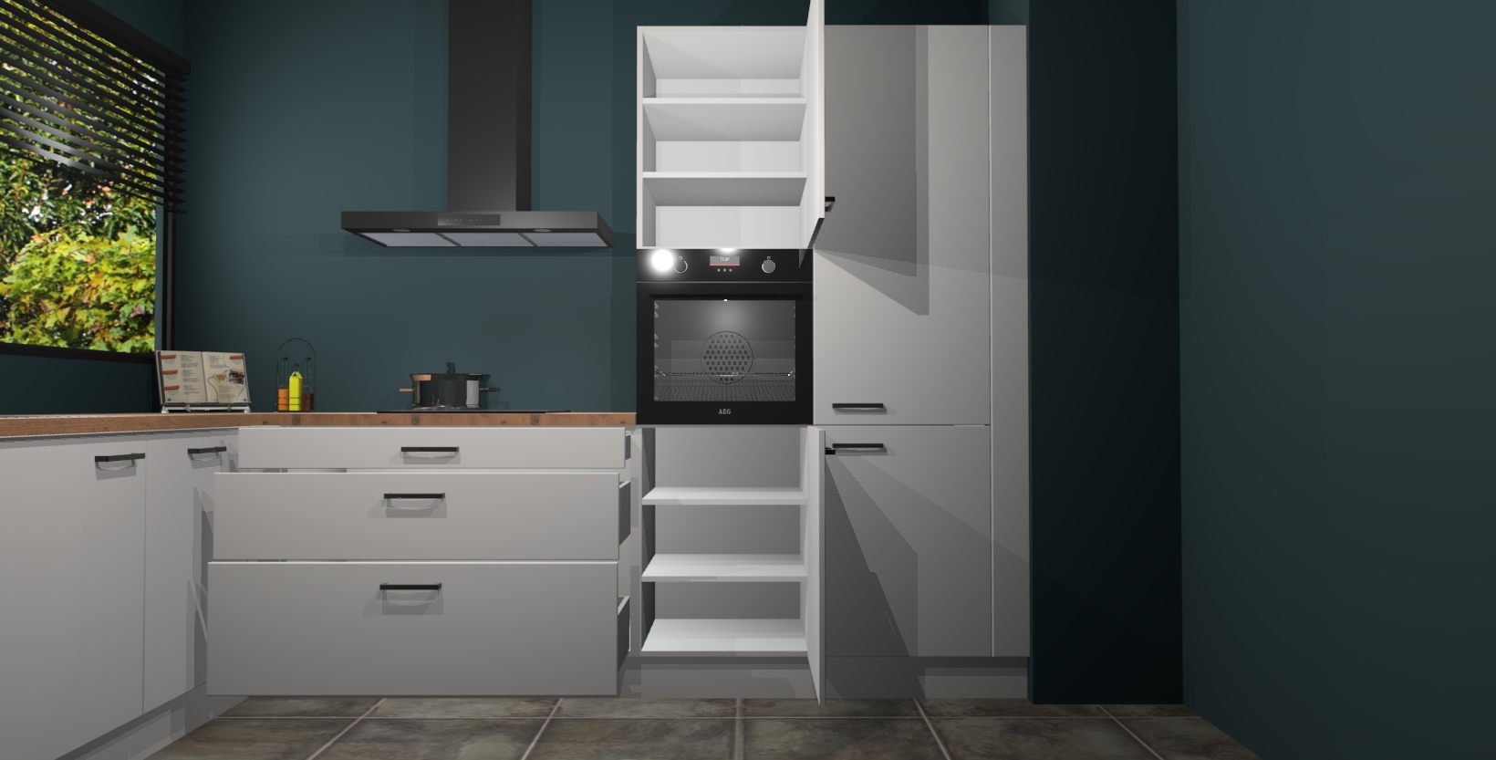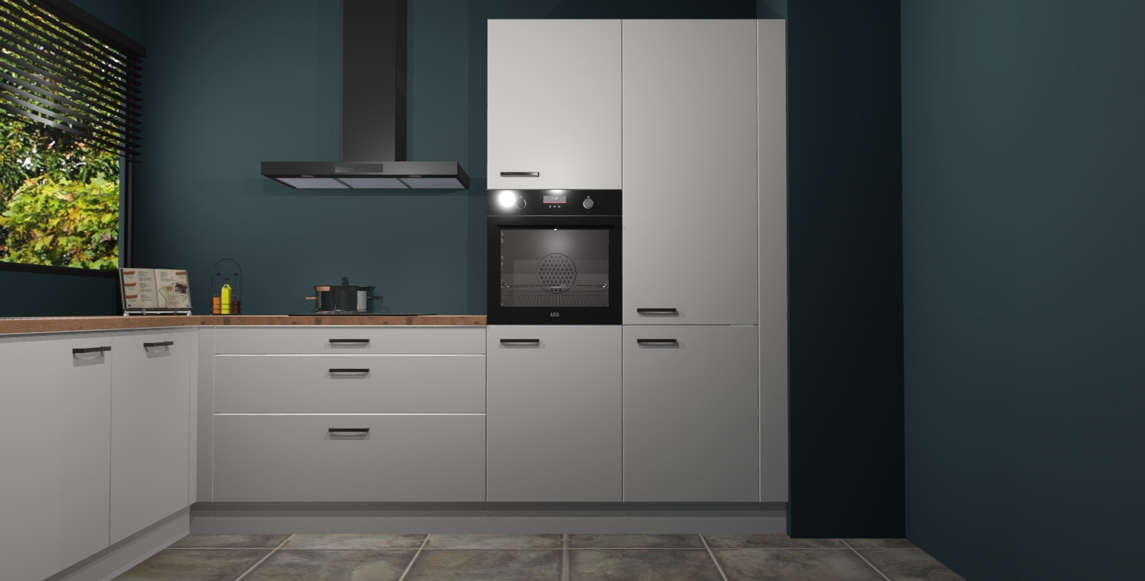 Met een modern, tijdloos design en ruime opslagruimte, zult u zich in no-time thuis voelen in uw nieuwe keuken. Uw leven wordt eenvoudiger met de soft-close deuren die voor het ultieme stille comfort zorgen - geen geluid dat u stoort terwijl u kookt. Ook is de keuken voorzien van 5 ingebouwde apparaten: een oven, inductie kookplaat, afzuigkap, vaatwasser en koelkast. Deze kunnen gemakkelijk na bestelling worden bijgewerkt naar AEG - waardoor uw luxe ervaring compleet is.