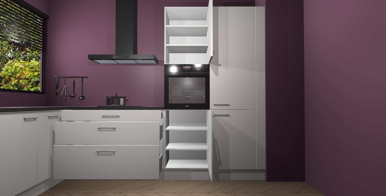 Met een modern, tijdloos design en ruime opslagruimte, zult u zich in no-time thuis voelen in uw nieuwe keuken. Uw leven wordt eenvoudiger met de soft-close deuren die voor het ultieme stille comfort zorgen - geen geluid dat u stoort terwijl u kookt. Ook is de keuken voorzien van 5 ingebouwde apparaten: een oven, inductie kookplaat, afzuigkap, vaatwasser en koelkast. Deze kunnen gemakkelijk na bestelling worden bijgewerkt naar AEG - waardoor uw luxe ervaring compleet is.