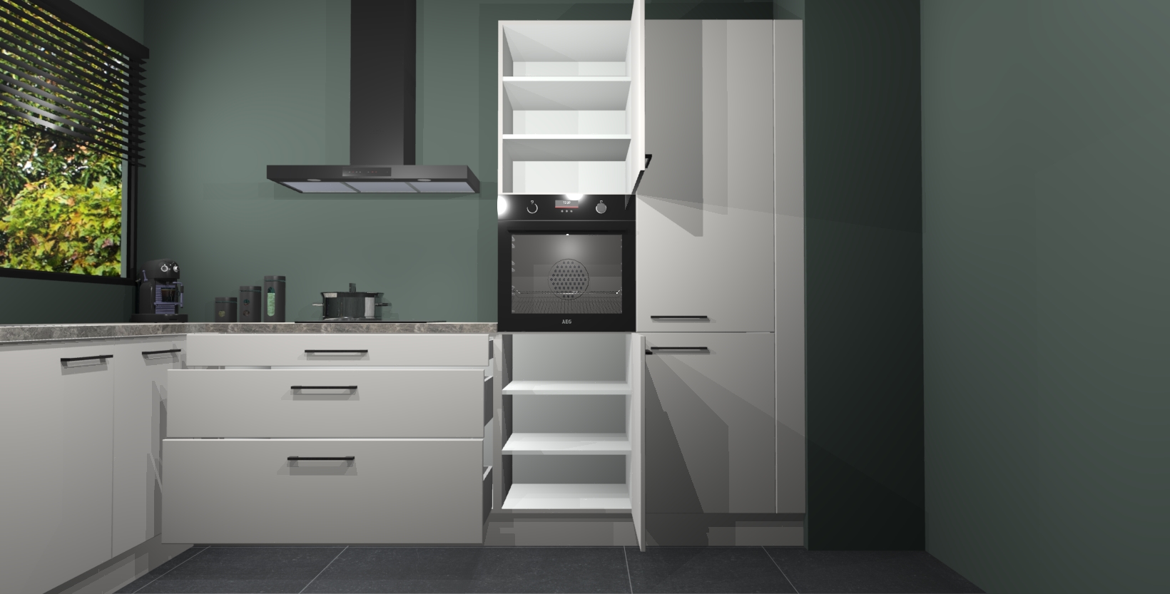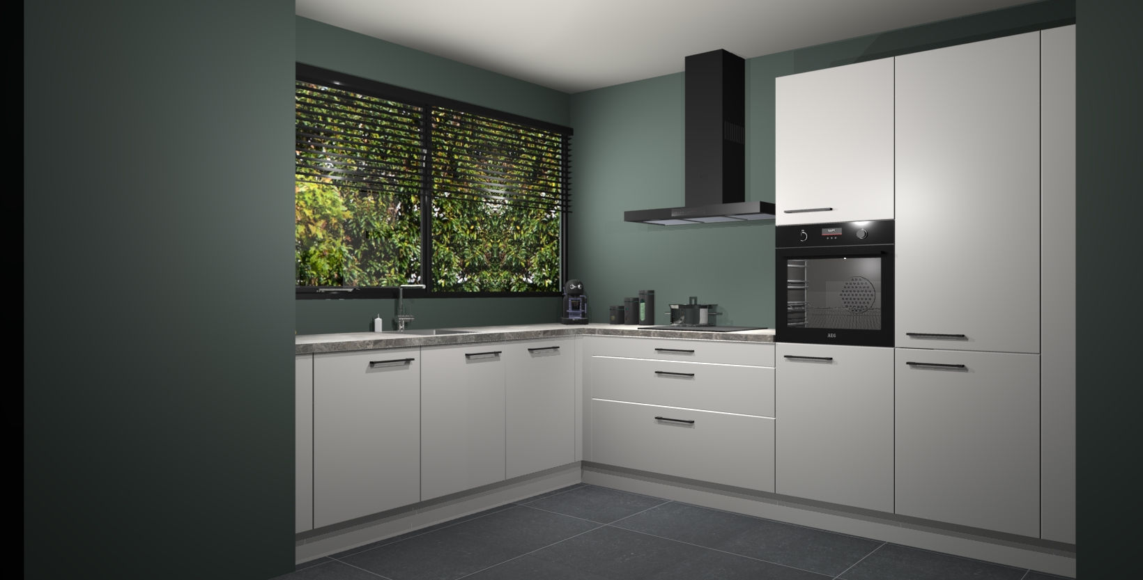 Met een modern, tijdloos design en ruime opslagruimte, zult u zich in no-time thuis voelen in uw nieuwe keuken. Uw leven wordt eenvoudiger met de soft-close deuren die voor het ultieme stille comfort zorgen - geen geluid dat u stoort terwijl u kookt. Ook is de keuken voorzien van 5 ingebouwde apparaten: een oven, inductie kookplaat, afzuigkap, vaatwasser en koelkast. Deze kunnen gemakkelijk na bestelling worden bijgewerkt naar AEG - waardoor uw luxe ervaring compleet is.