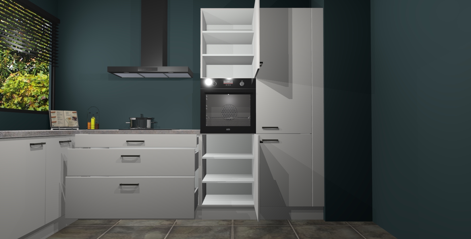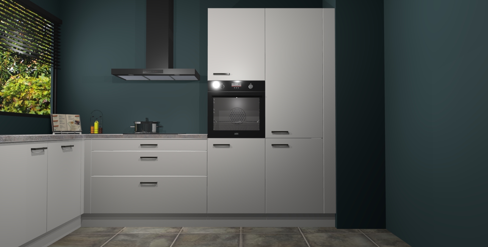 Met een modern, tijdloos design en ruime opslagruimte, zult u zich in no-time thuis voelen in uw nieuwe keuken. Uw leven wordt eenvoudiger met de soft-close deuren die voor het ultieme stille comfort zorgen - geen geluid dat u stoort terwijl u kookt. Ook is de keuken voorzien van 5 ingebouwde apparaten: een oven, inductie kookplaat, afzuigkap, vaatwasser en koelkast. Deze kunnen gemakkelijk na bestelling worden bijgewerkt naar AEG - waardoor uw luxe ervaring compleet is.
