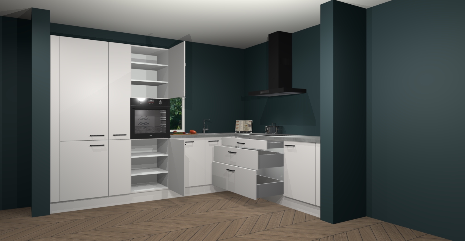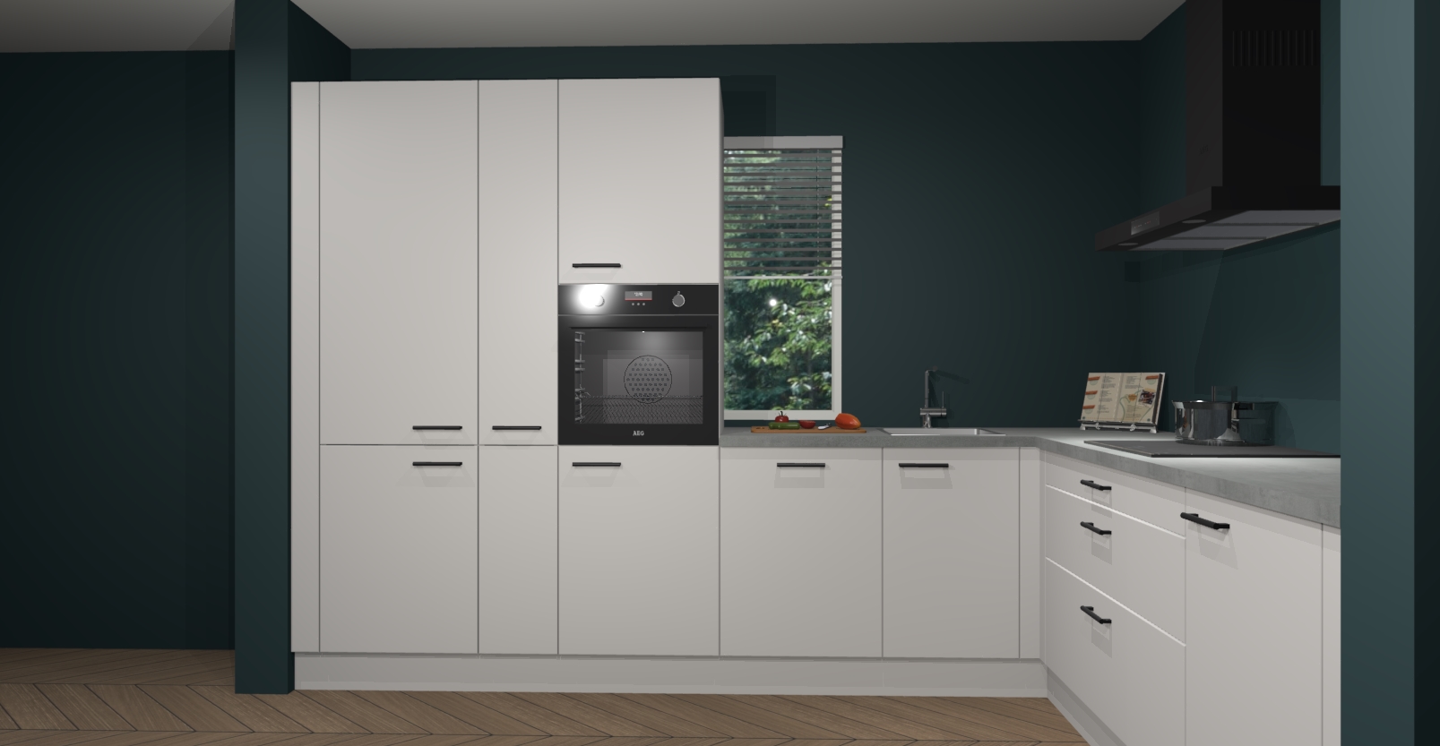 Met een modern, tijdloos design en ruime opslagruimte, zult u zich in no-time thuis voelen in uw nieuwe keuken. Uw leven wordt eenvoudiger met de soft-close deuren die voor het ultieme stille comfort zorgen - geen geluid dat u stoort terwijl u kookt. Ook is de keuken voorzien van 5 ingebouwde apparaten: een oven, inductie kookplaat, afzuigkap, vaatwasser en koelkast. Deze kunnen gemakkelijk na bestelling worden bijgewerkt naar AEG - waardoor uw luxe ervaring compleet is.