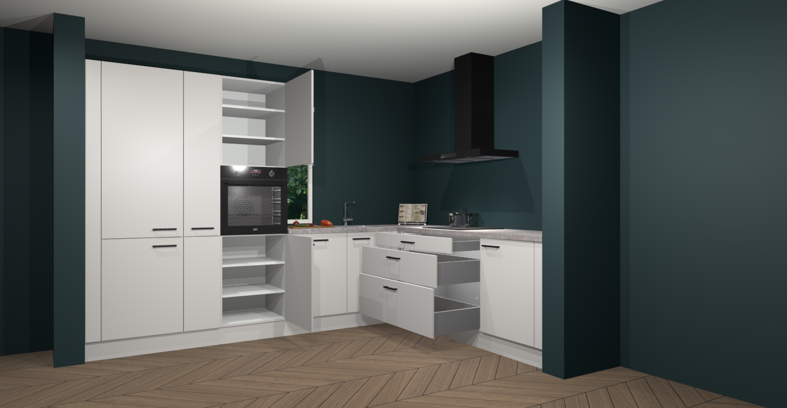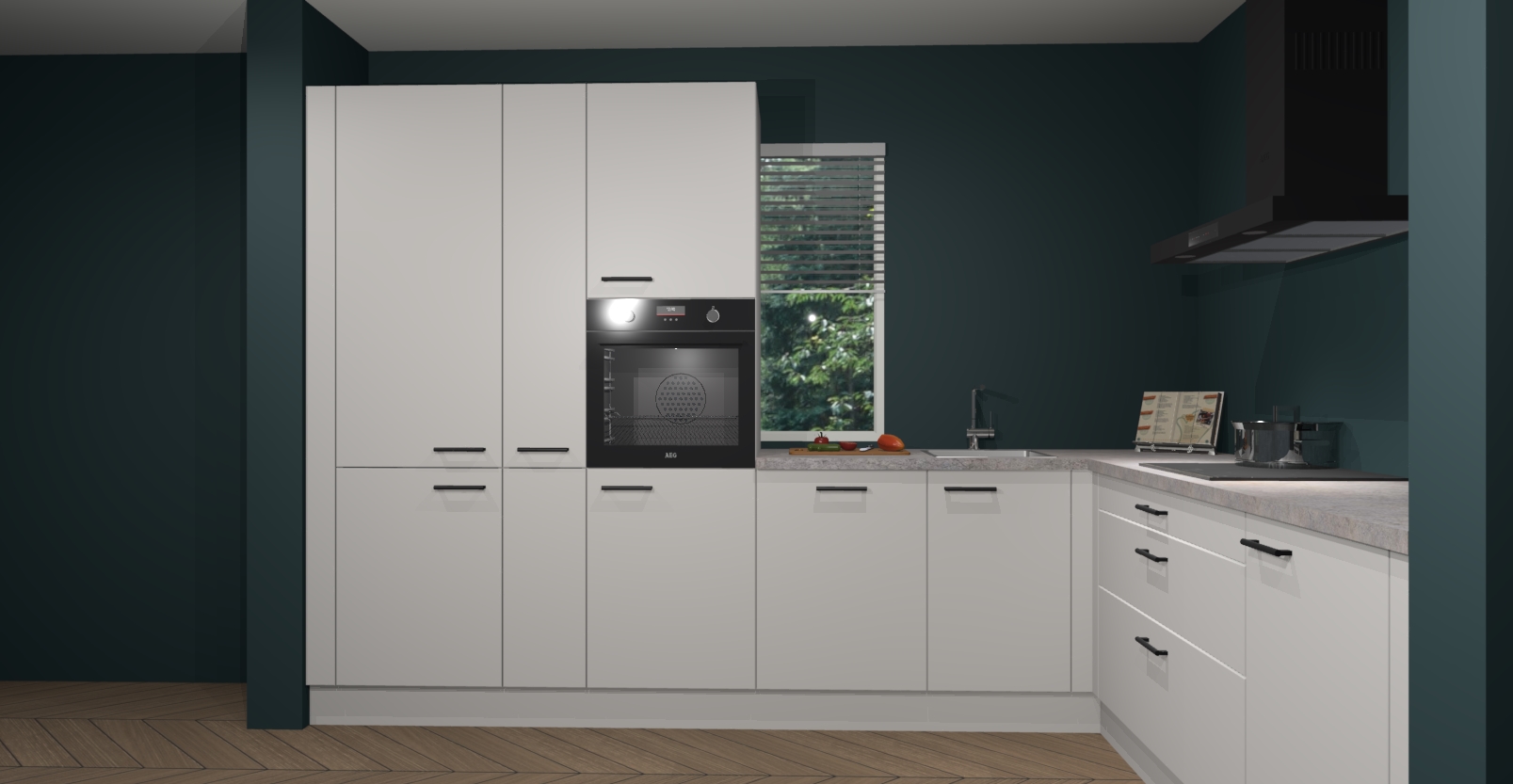 Met een modern, tijdloos design en ruime opslagruimte, zult u zich in no-time thuis voelen in uw nieuwe keuken. Uw leven wordt eenvoudiger met de soft-close deuren die voor het ultieme stille comfort zorgen - geen geluid dat u stoort terwijl u kookt. Ook is de keuken voorzien van 5 ingebouwde apparaten: een oven, inductie kookplaat, afzuigkap, vaatwasser en koelkast. Deze kunnen gemakkelijk na bestelling worden bijgewerkt naar AEG - waardoor uw luxe ervaring compleet is.