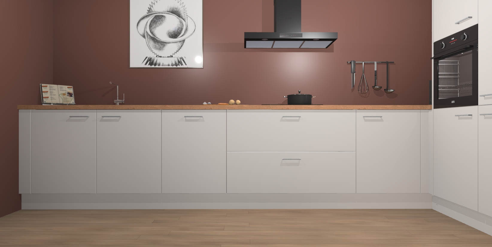 Welkom bij de Zijdegrijze keuken Khao Lak. Deze prachtige keuken zal de komende jaren het middelpunt van de belangstelling in uw huis zijn. Uitgerust met vijf inbouwapparaten komt u nooit kookgereedschap tekort. Bovendien geeft de warme houtlook elke ruimte een uitnodigende en tijdloze uitstraling.