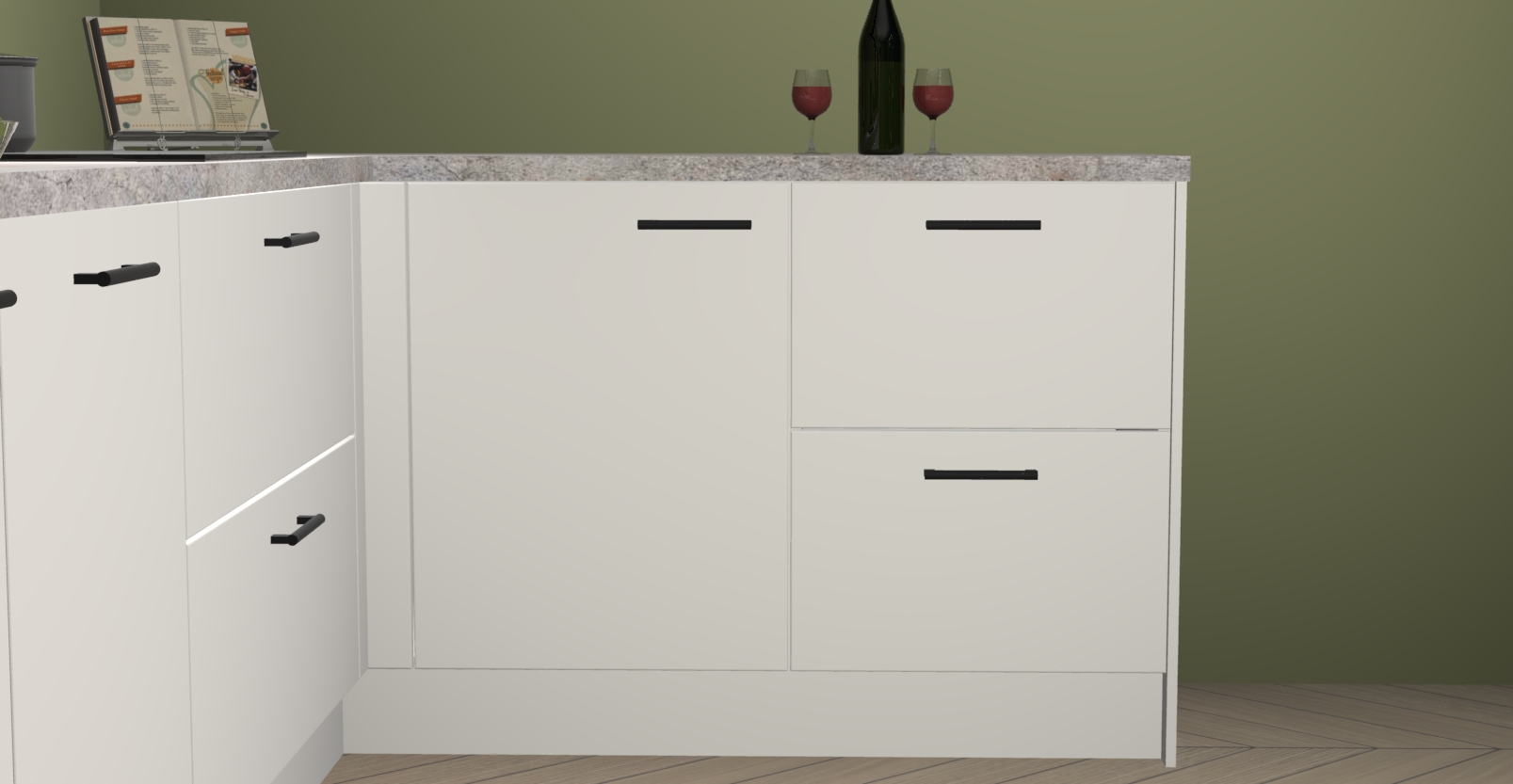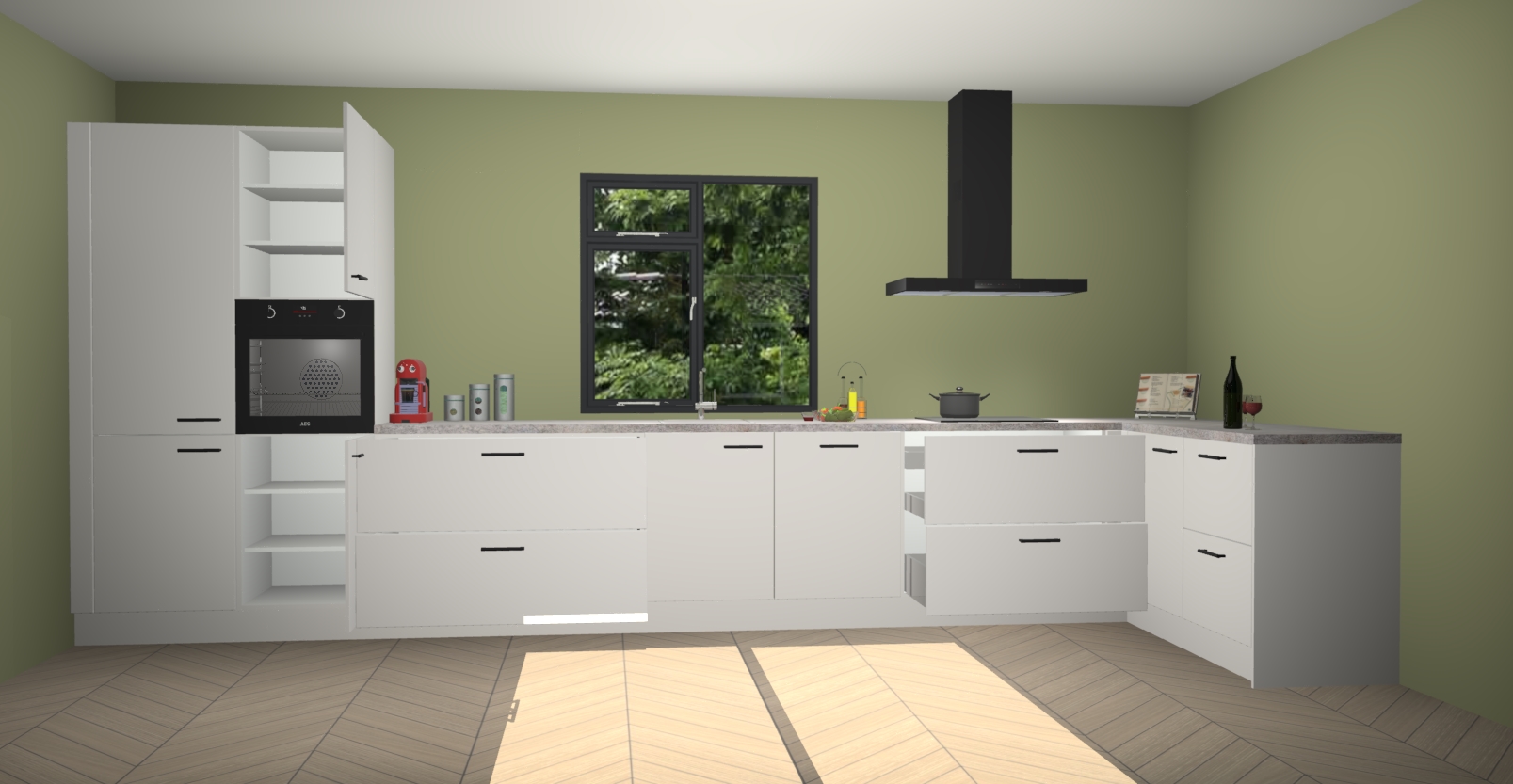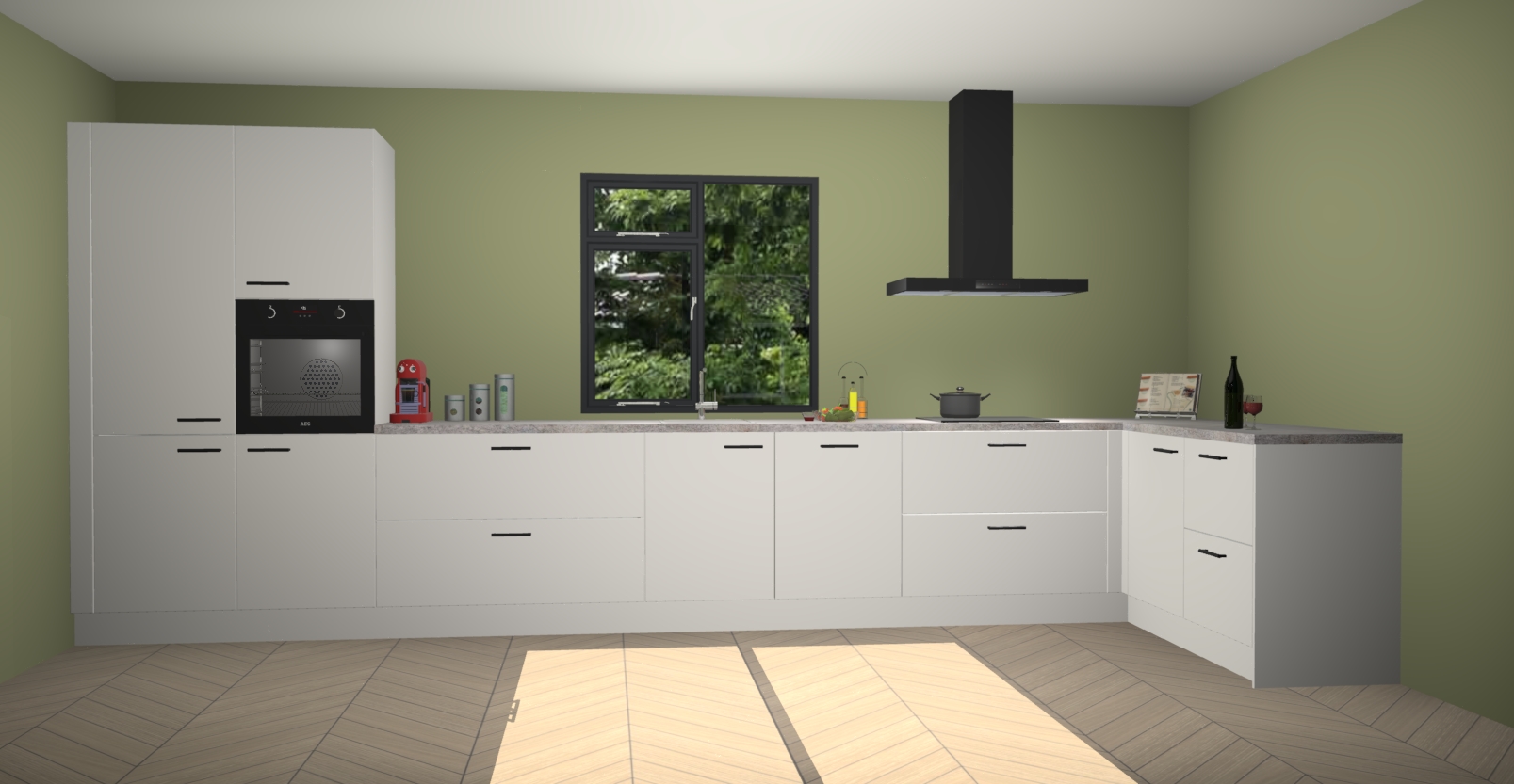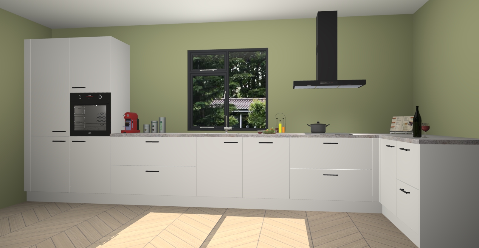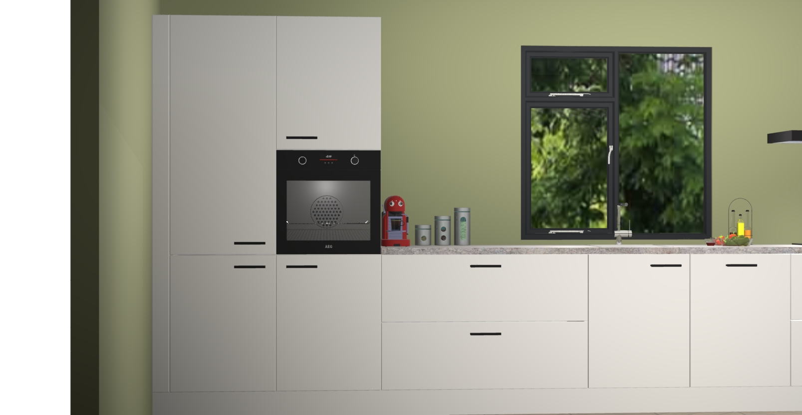 De Zijdegrijze keuken Lille wordt geleverd met vijf inbouwapparaten - een oven, inductiekookplaat, afzuigkap, vaatwasser en koelkast. Maar dat is nog niet alles! Na bestelling kunnen deze apparaten eenvoudig worden geüpgraded naar premium AEG-apparatuur. Bovendien is er zelfs de optie om de oven te vervangen door een combimagnetron of uw inductiekookplaat te vervangen door een kookplaat met geïntegreerde afzuiging.