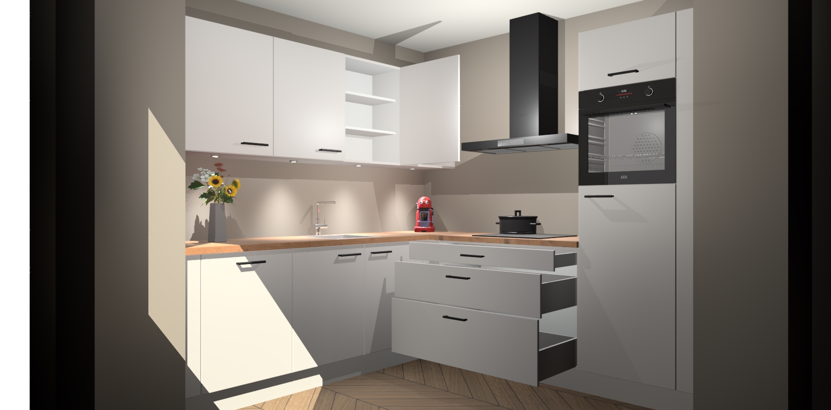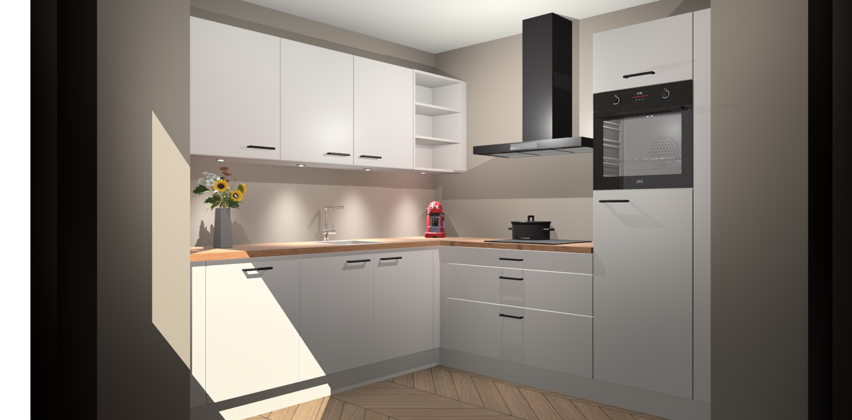 Met een modern, tijdloos design en ruime opslagruimte, zult u zich in no-time thuis voelen in uw nieuwe keuken. Uw leven wordt eenvoudiger met de soft-close deuren die voor het ultieme stille comfort zorgen - geen geluid dat u stoort terwijl u kookt. Ook is de keuken voorzien van 5 ingebouwde apparaten: een oven, inductie kookplaat, afzuigkap, vaatwasser en koelkast. Deze kunnen gemakkelijk na bestelling worden bijgewerkt naar AEG - waardoor uw luxe ervaring compleet is.