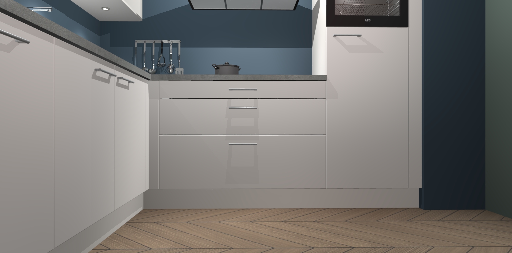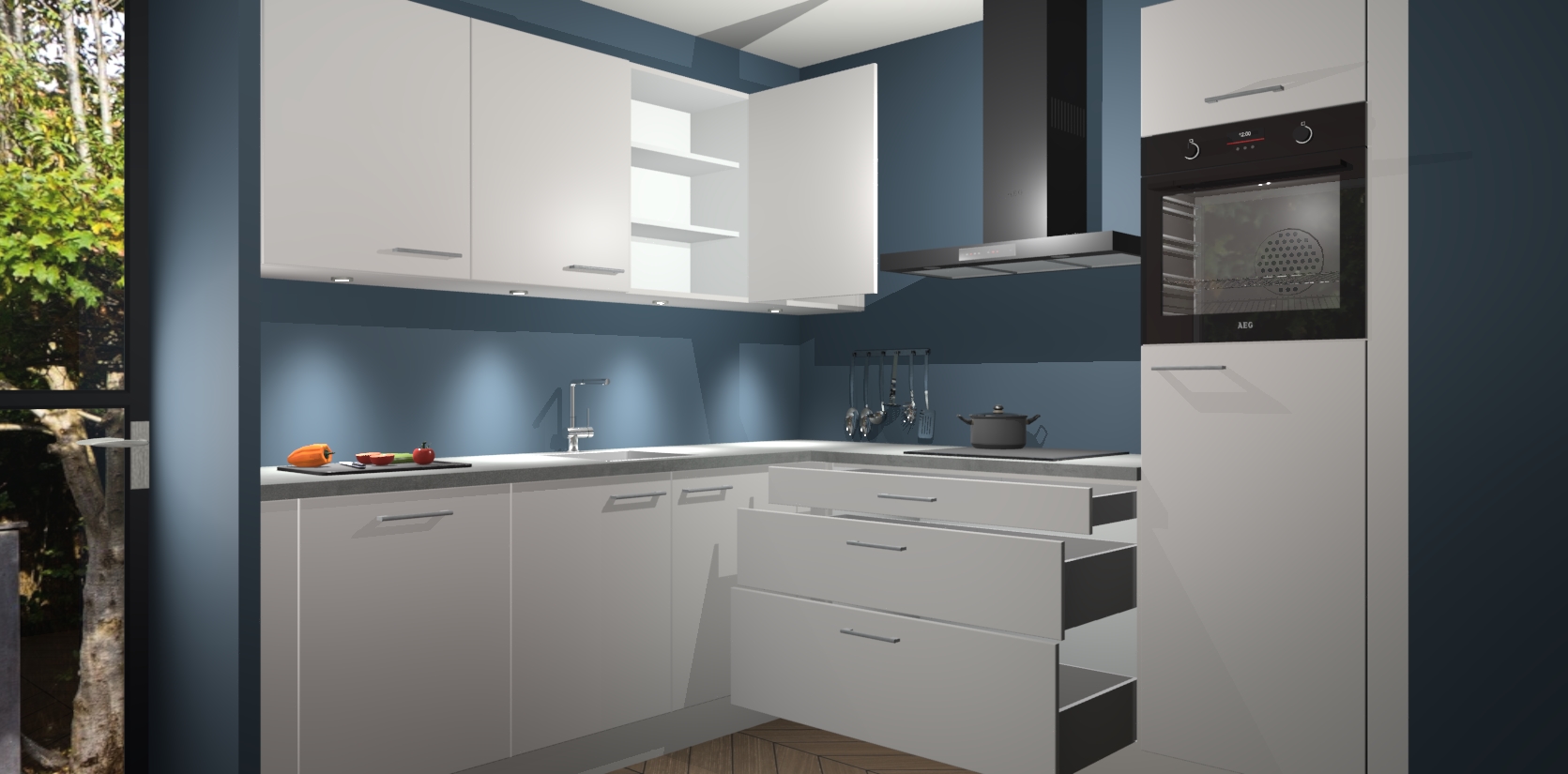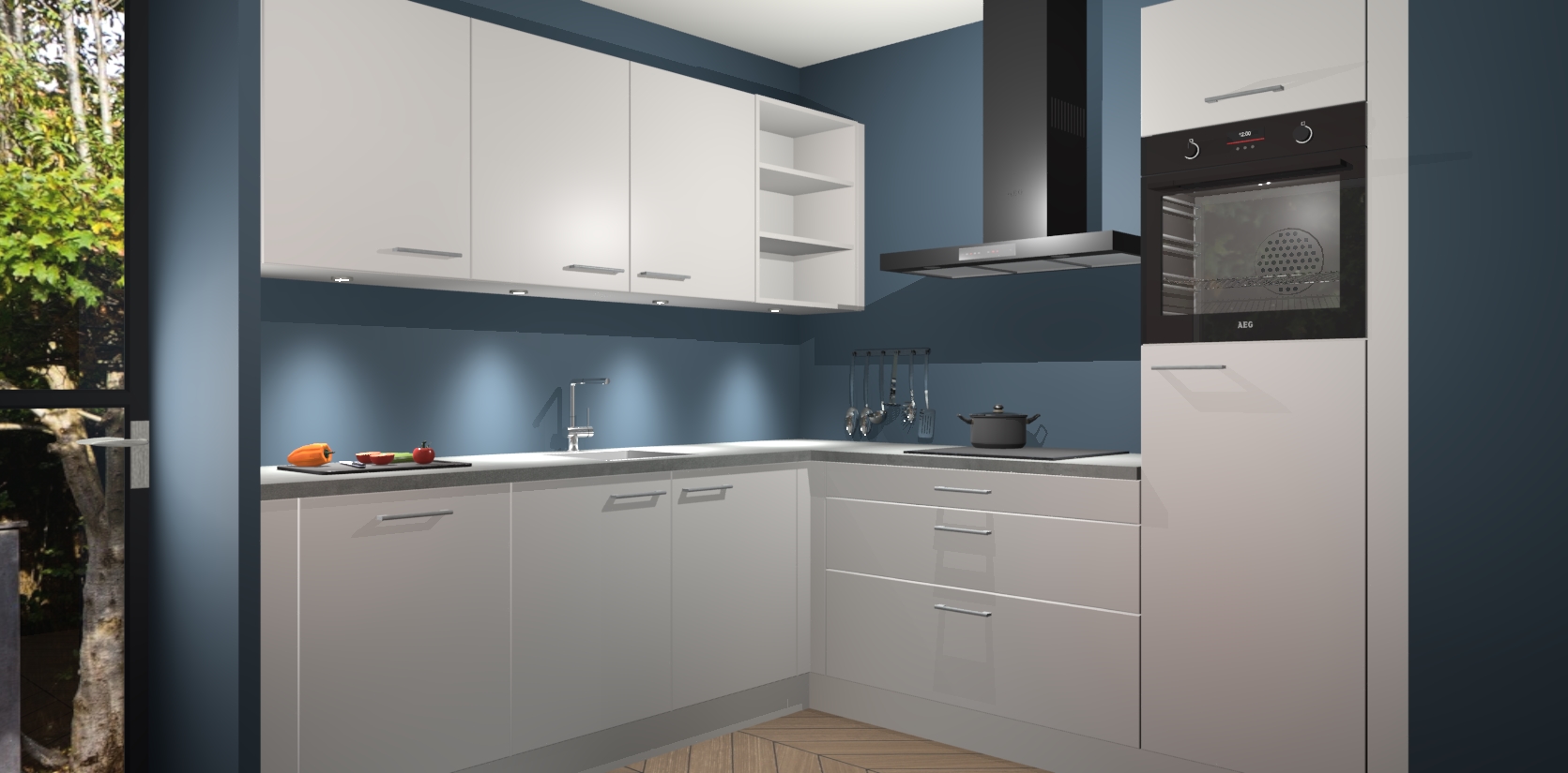 Met een modern, tijdloos design en ruime opslagruimte, zult u zich in no-time thuis voelen in uw nieuwe keuken. Uw leven wordt eenvoudiger met de soft-close deuren die voor het ultieme stille comfort zorgen - geen geluid dat u stoort terwijl u kookt. Ook is de keuken voorzien van 5 ingebouwde apparaten: een oven, inductie kookplaat, afzuigkap, vaatwasser en koelkast. Deze kunnen gemakkelijk na bestelling worden bijgewerkt naar AEG - waardoor uw luxe ervaring compleet is.