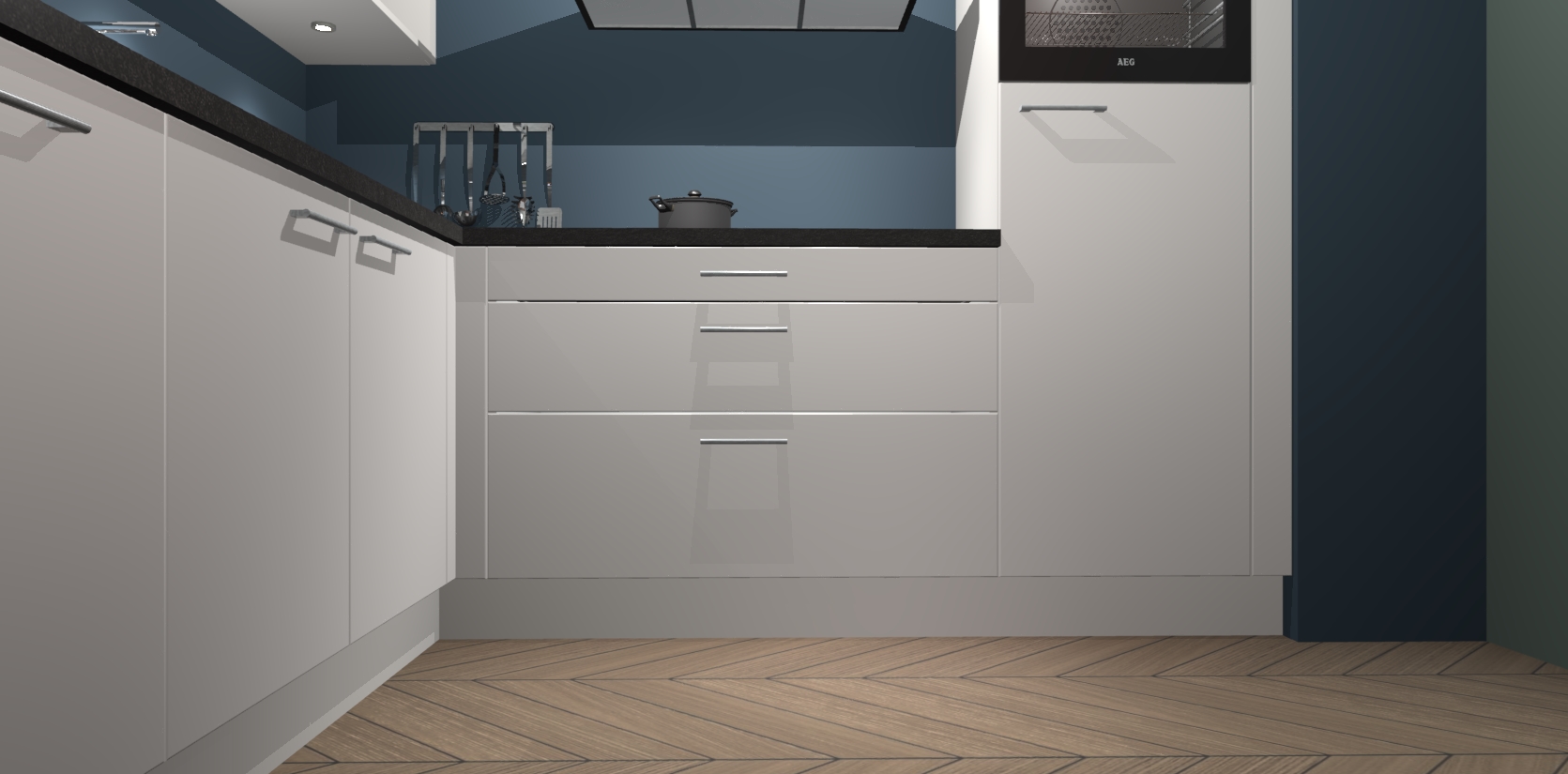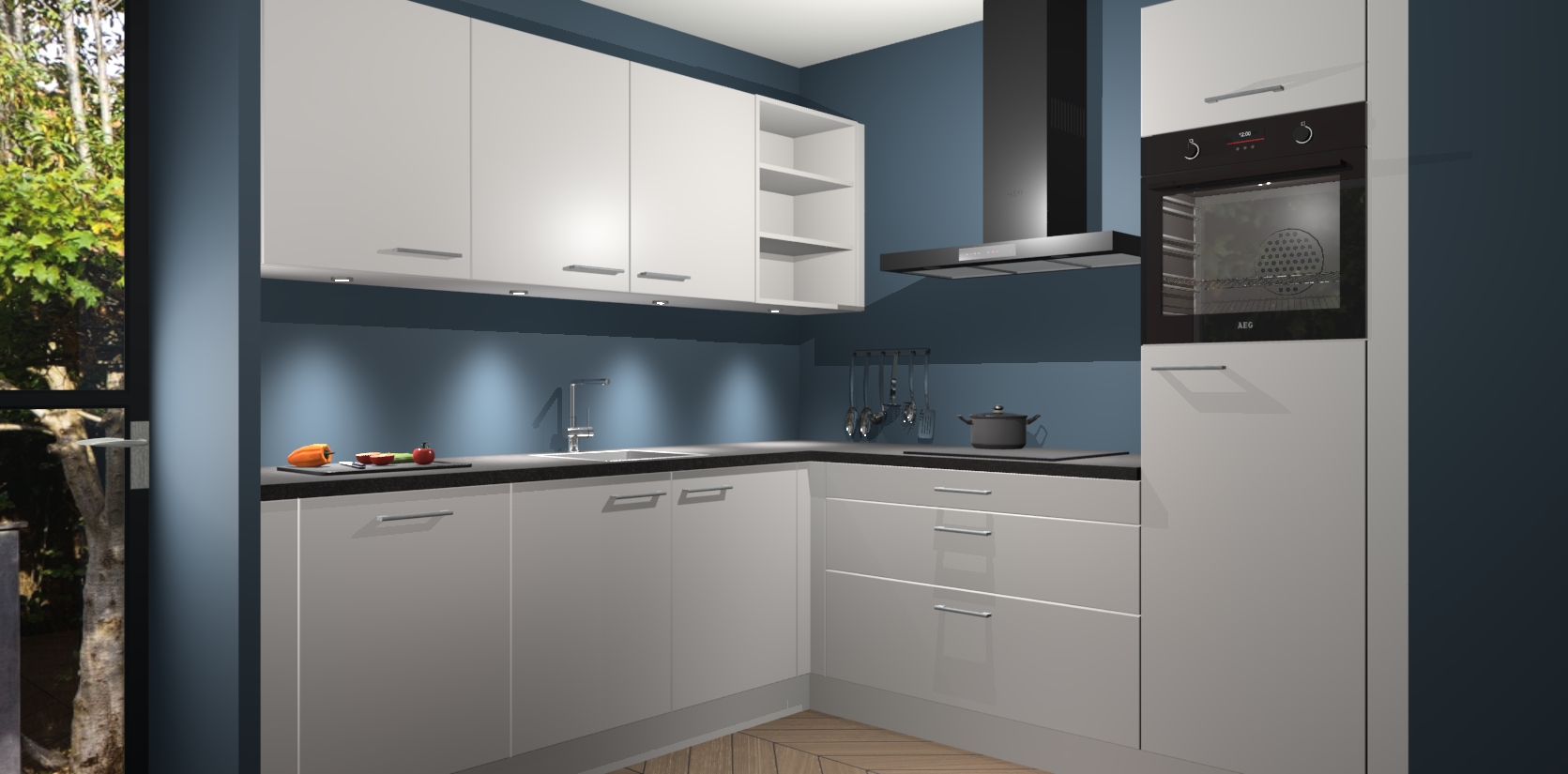 Met een modern, tijdloos design en ruime opslagruimte, zult u zich in no-time thuis voelen in uw nieuwe keuken. Uw leven wordt eenvoudiger met de soft-close deuren die voor het ultieme stille comfort zorgen - geen geluid dat u stoort terwijl u kookt. Ook is de keuken voorzien van 5 ingebouwde apparaten: een oven, inductie kookplaat, afzuigkap, vaatwasser en koelkast. Deze kunnen gemakkelijk na bestelling worden bijgewerkt naar AEG - waardoor uw luxe ervaring compleet is.