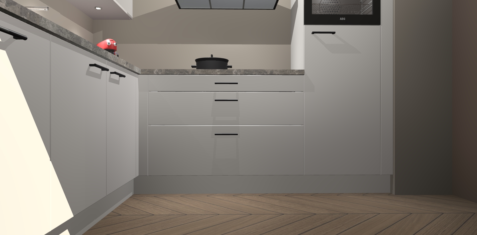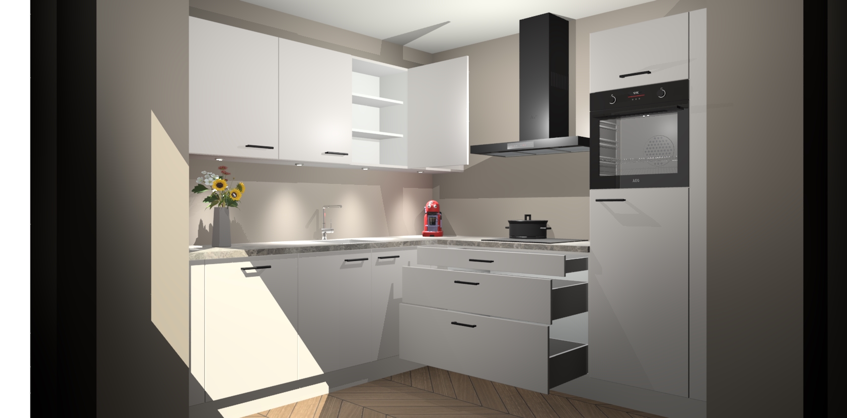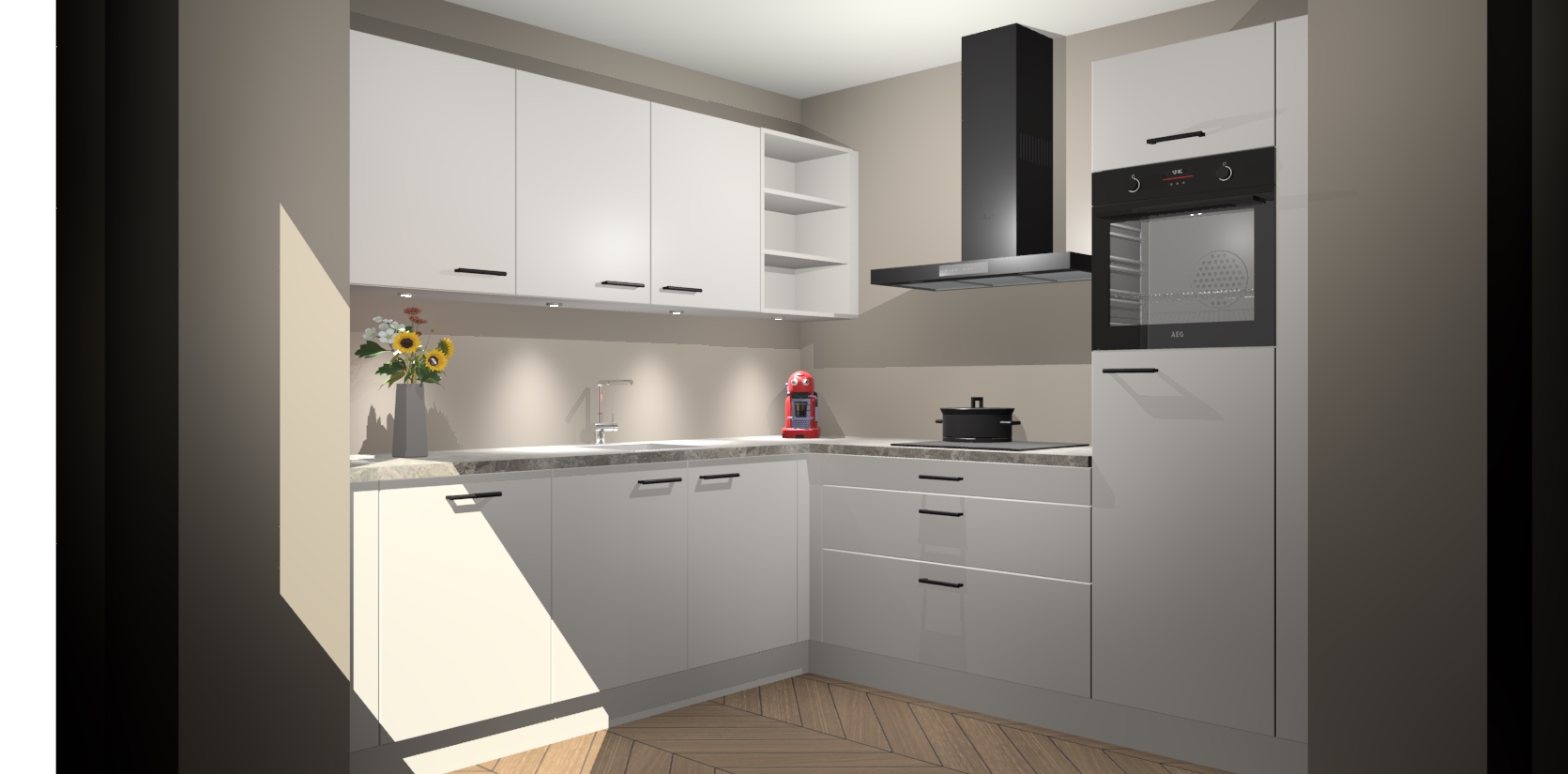 Met een modern, tijdloos design en ruime opslagruimte, zult u zich in no-time thuis voelen in uw nieuwe keuken. Uw leven wordt eenvoudiger met de soft-close deuren die voor het ultieme stille comfort zorgen - geen geluid dat u stoort terwijl u kookt. Ook is de keuken voorzien van 5 ingebouwde apparaten: een oven, inductie kookplaat, afzuigkap, vaatwasser en koelkast. Deze kunnen gemakkelijk na bestelling worden bijgewerkt naar AEG - waardoor uw luxe ervaring compleet is.