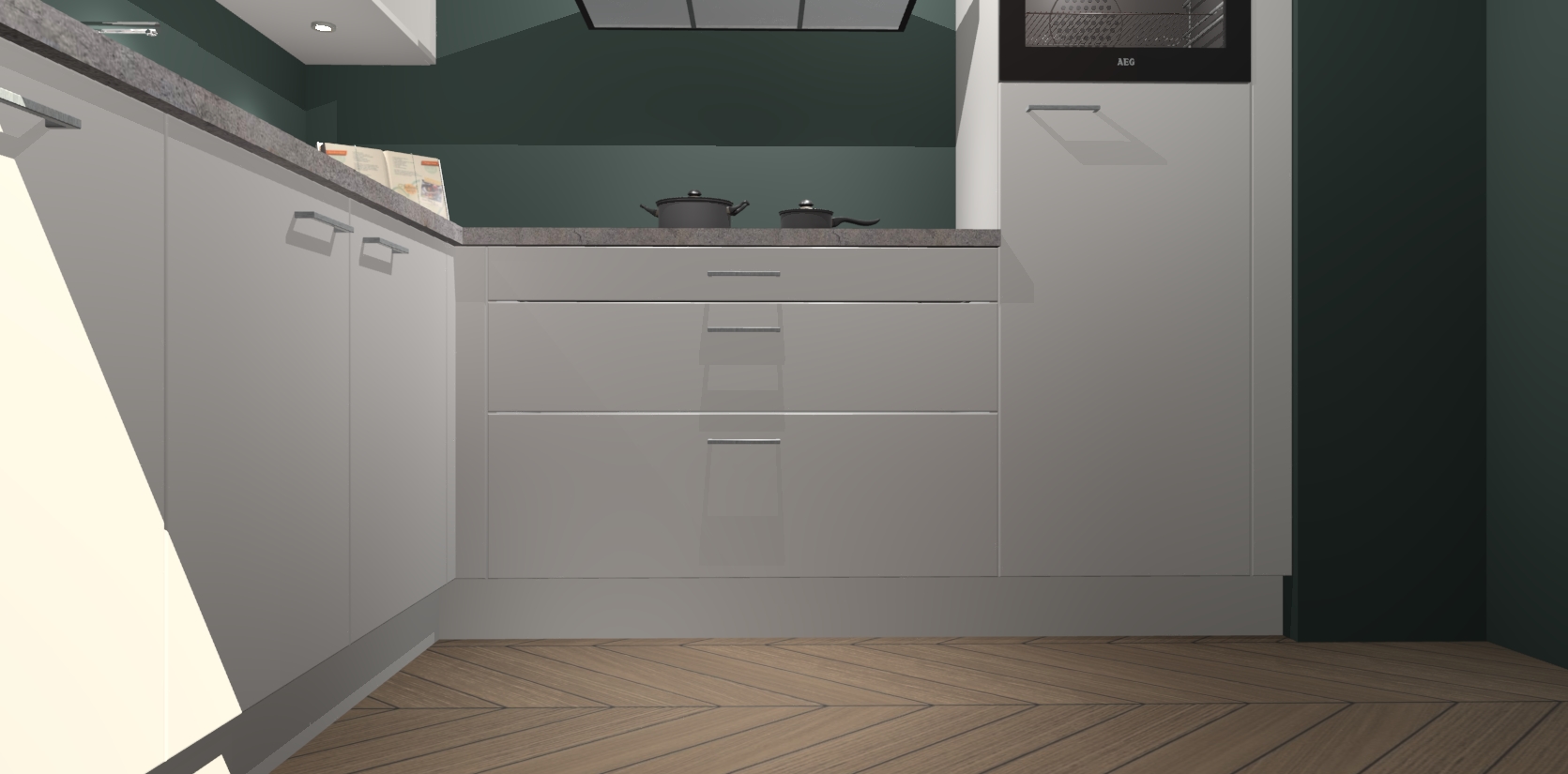 Met een modern, tijdloos design en ruime opslagruimte, zult u zich in no-time thuis voelen in uw nieuwe keuken. Uw leven wordt eenvoudiger met de soft-close deuren die voor het ultieme stille comfort zorgen - geen geluid dat u stoort terwijl u kookt. Ook is de keuken voorzien van 5 ingebouwde apparaten: een oven, inductie kookplaat, afzuigkap, vaatwasser en koelkast. Deze kunnen gemakkelijk na bestelling worden bijgewerkt naar AEG - waardoor uw luxe ervaring compleet is.