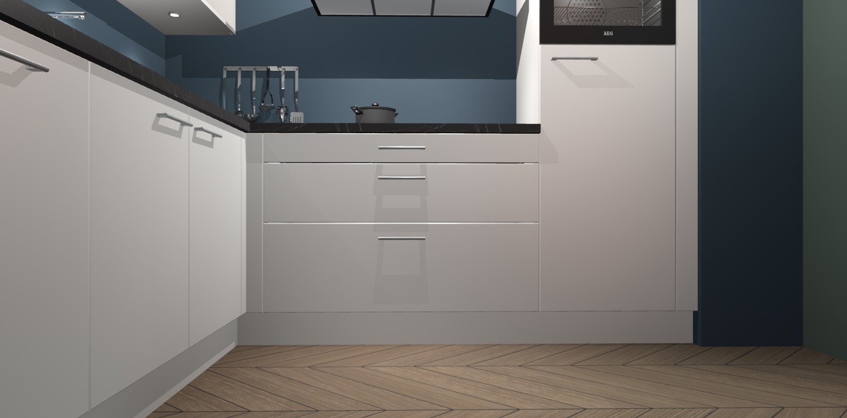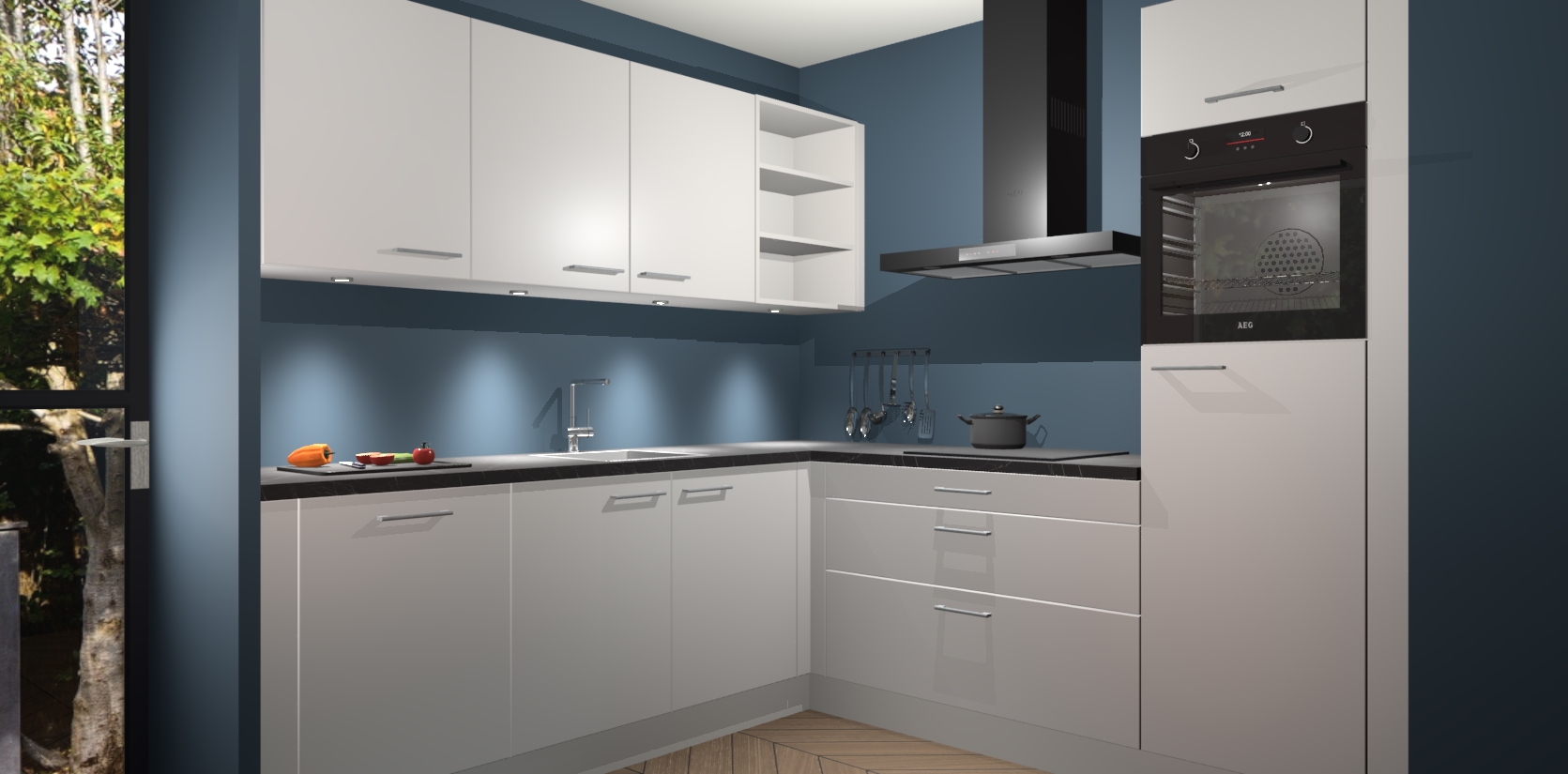 Met een modern, tijdloos design en ruime opslagruimte, zult u zich in no-time thuis voelen in uw nieuwe keuken. Uw leven wordt eenvoudiger met de soft-close deuren die voor het ultieme stille comfort zorgen - geen geluid dat u stoort terwijl u kookt. Ook is de keuken voorzien van 5 ingebouwde apparaten: een oven, inductie kookplaat, afzuigkap, vaatwasser en koelkast. Deze kunnen gemakkelijk na bestelling worden bijgewerkt naar AEG - waardoor uw luxe ervaring compleet is.