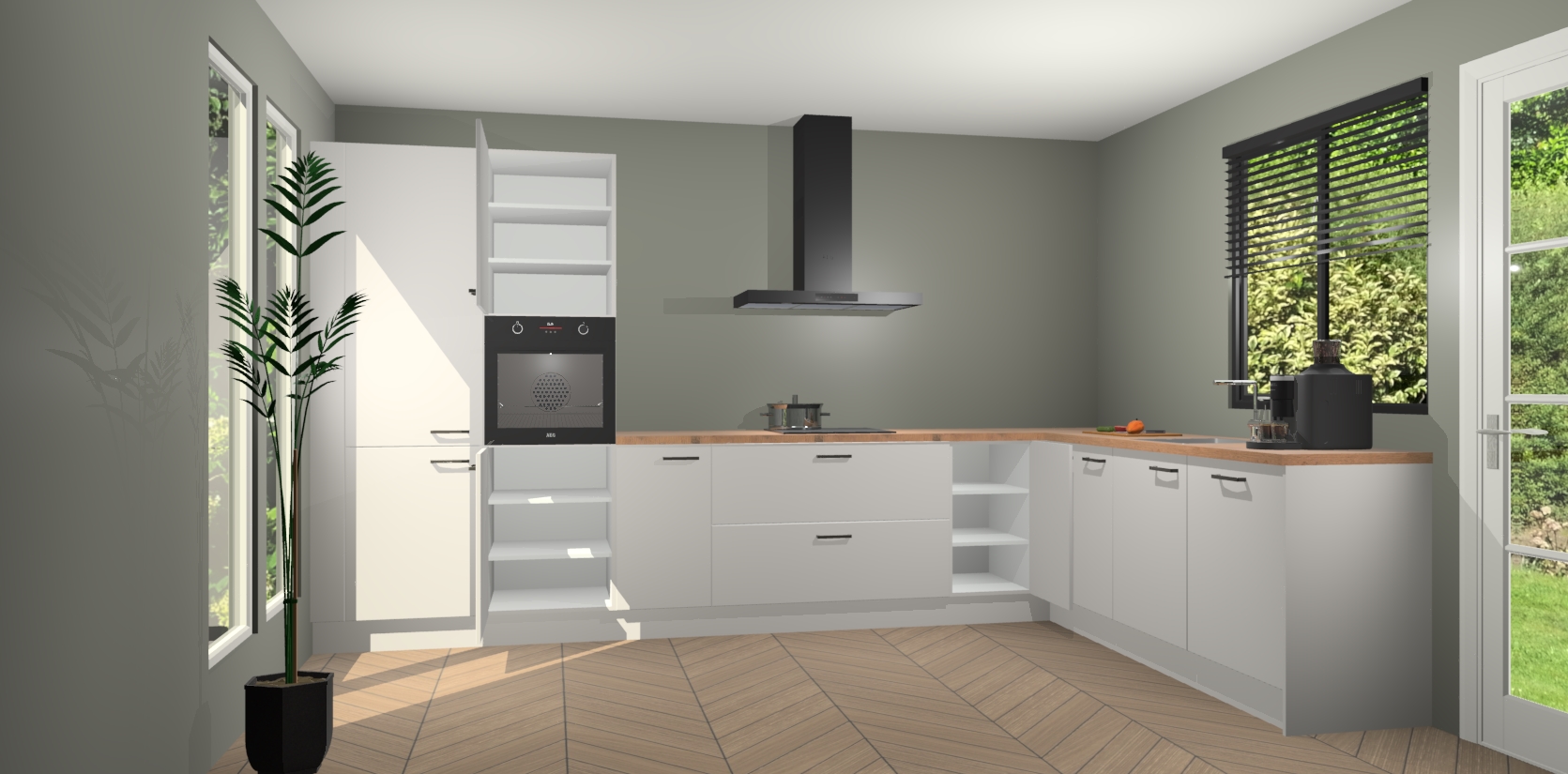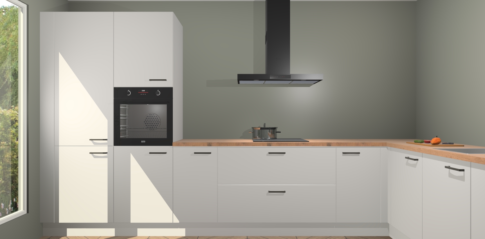 Met een modern, tijdloos design en ruime opslagruimte, zult u zich in no-time thuis voelen in uw nieuwe keuken. Uw leven wordt eenvoudiger met de soft-close deuren die voor het ultieme stille comfort zorgen - geen geluid dat u stoort terwijl u kookt. Ook is de keuken voorzien van 5 ingebouwde apparaten: een oven, inductie kookplaat, afzuigkap, vaatwasser en koelkast. Deze kunnen gemakkelijk na bestelling worden bijgewerkt naar AEG - waardoor uw luxe ervaring compleet is.