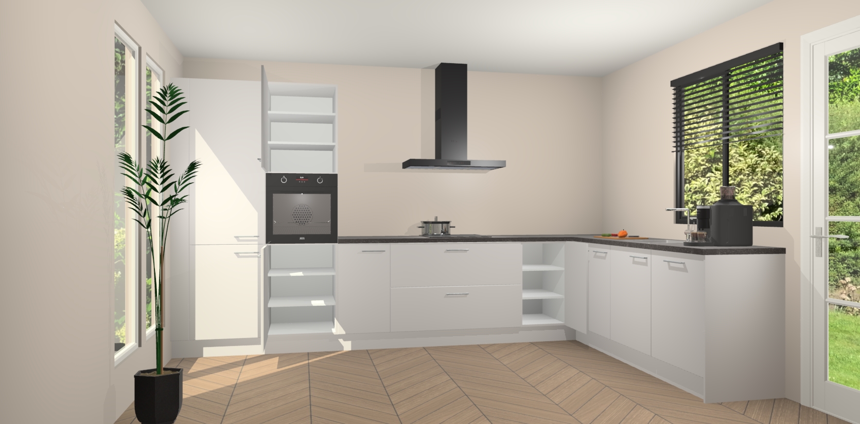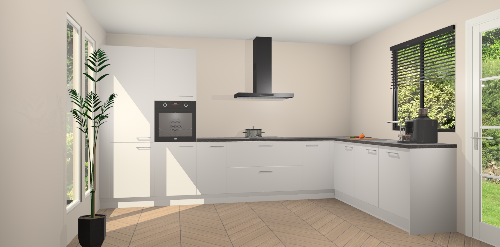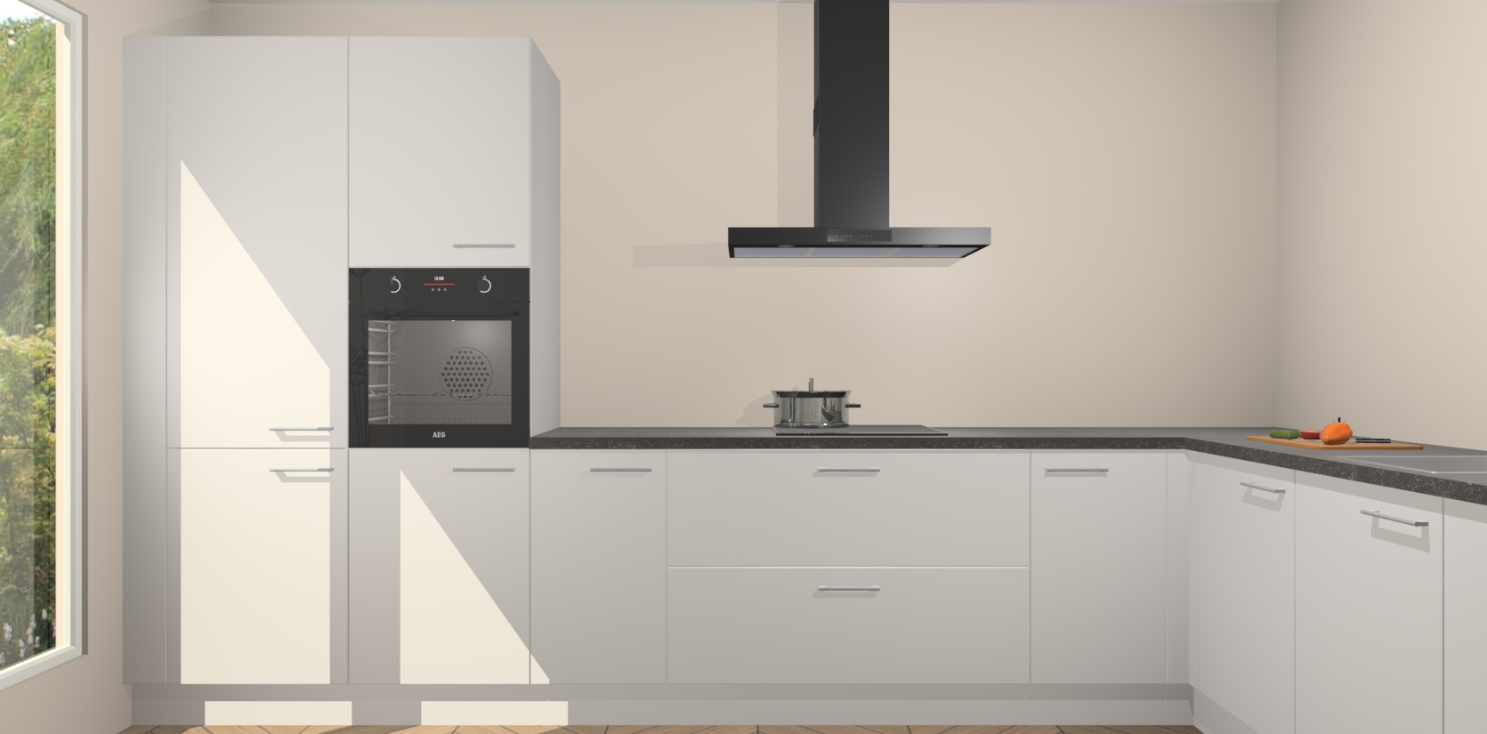 Met een modern, tijdloos design en ruime opslagruimte, zult u zich in no-time thuis voelen in uw nieuwe keuken. Uw leven wordt eenvoudiger met de soft-close deuren die voor het ultieme stille comfort zorgen - geen geluid dat u stoort terwijl u kookt. Ook is de keuken voorzien van 5 ingebouwde apparaten: een oven, inductie kookplaat, afzuigkap, vaatwasser en koelkast. Deze kunnen gemakkelijk na bestelling worden bijgewerkt naar AEG - waardoor uw luxe ervaring compleet is.