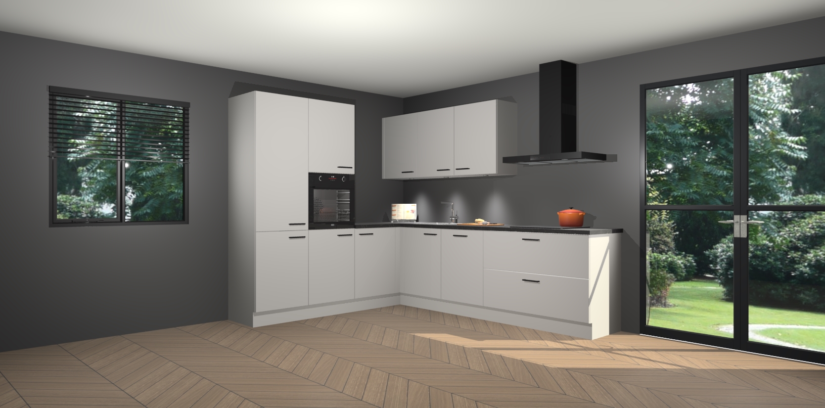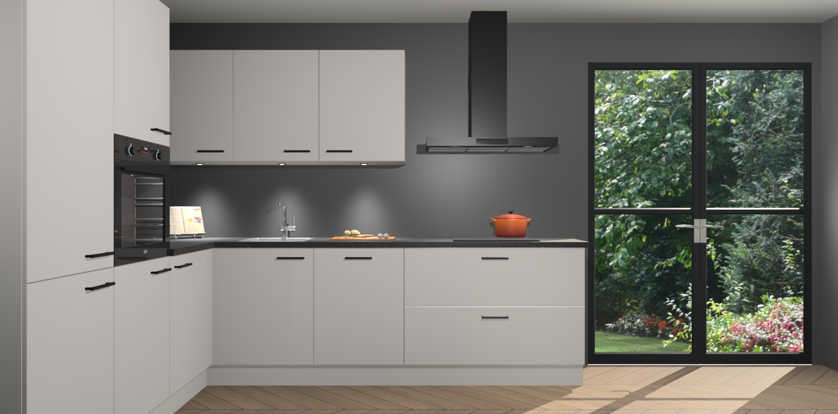 Maak kennis met de zijdegrijze keuken Parla - de perfecte aanvulling voor uw moderne keuken! Ervaar tijdloos design, elegantie en een chique uitstraling met onze zwarte handgrepen, soft-close deuren en veel opbergruimte. Dit alles wordt aangeboden tegen een vaste lage prijs voor ongeëvenaarde Duitse keukenkwaliteit!