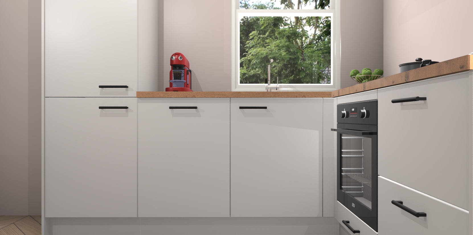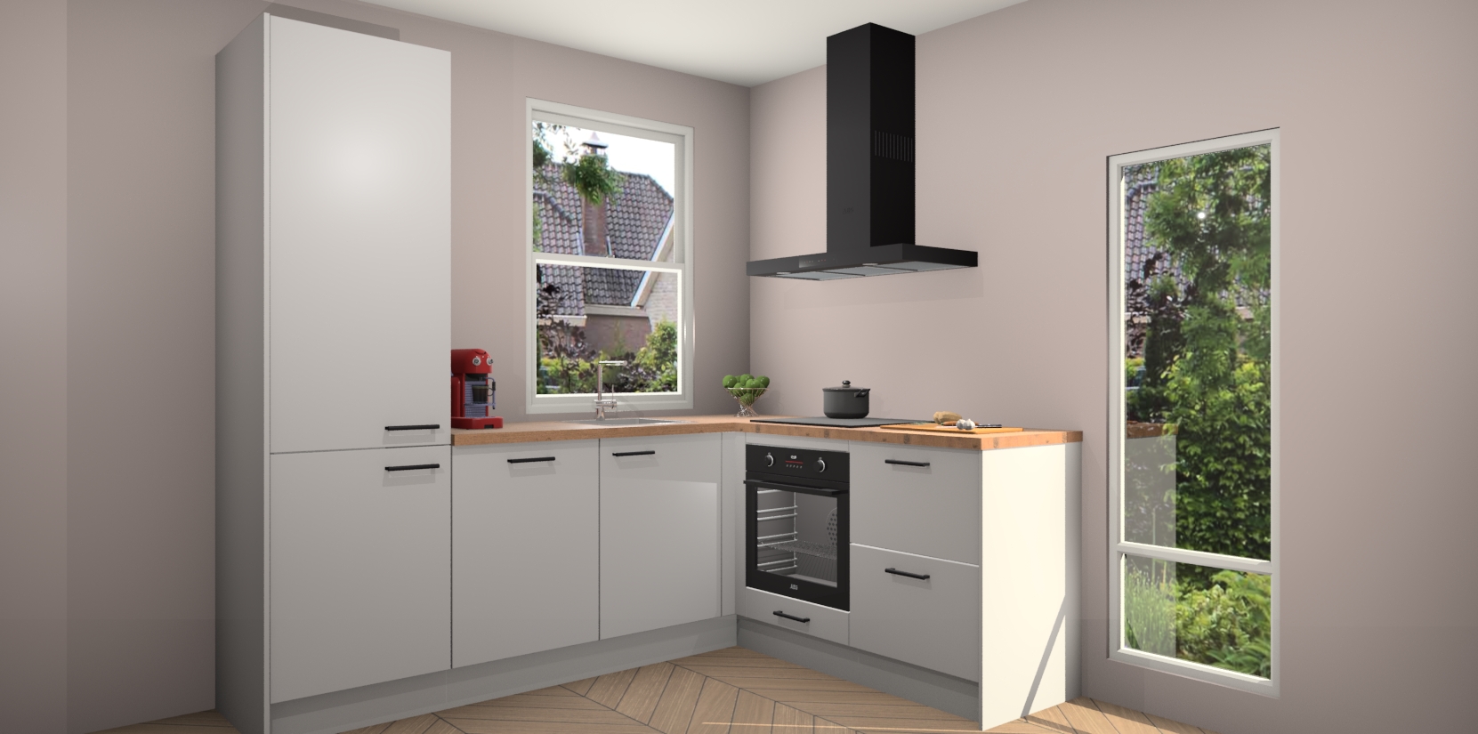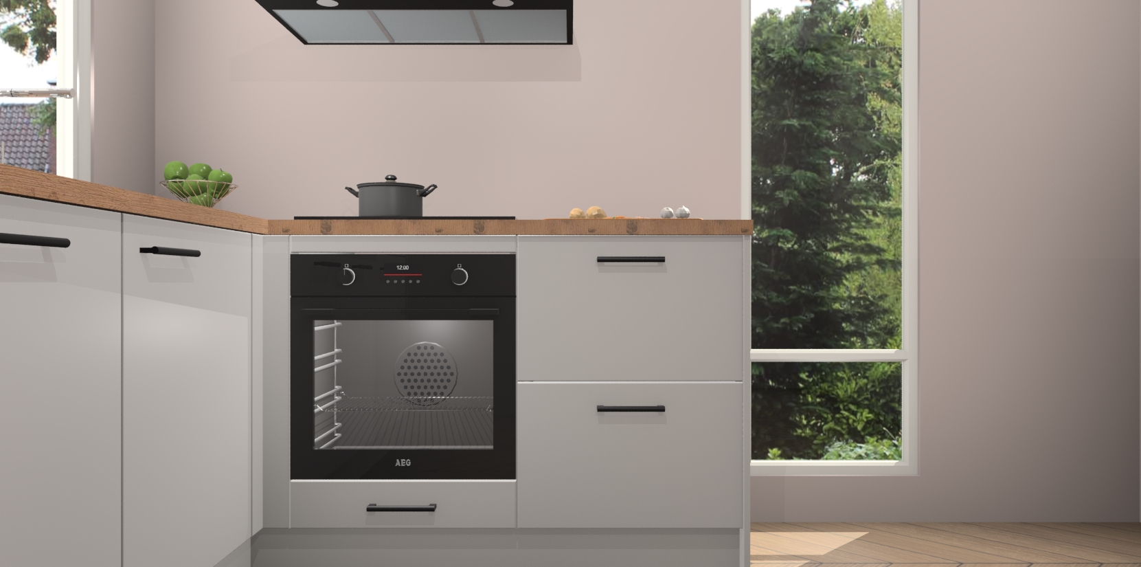 De Zijdegrijze keuken Phuket heeft alles wat u maar kunt wensen. Niet alleen zijn er softclose deuren, maar ook 5 ingebouwde apparaten: een oven, inductiekookplaat, afzuigkap, vaatwasser en koelkast - waarbij u later gemakkelijk naar het AEG merk, van inductiekookplaat naar kookplaat met geïntegreerde afzuiging of van oven naar combimagnetron kunt upgraden. Dat alles tegen een vast laag tarief! Bovendien geeft de Zijdegrijze keuken Phuket supersnelle levering van 7 weken. Echt iets voor u als u er niet op wilt wachten om het resultaat te zien in eigen keuken!