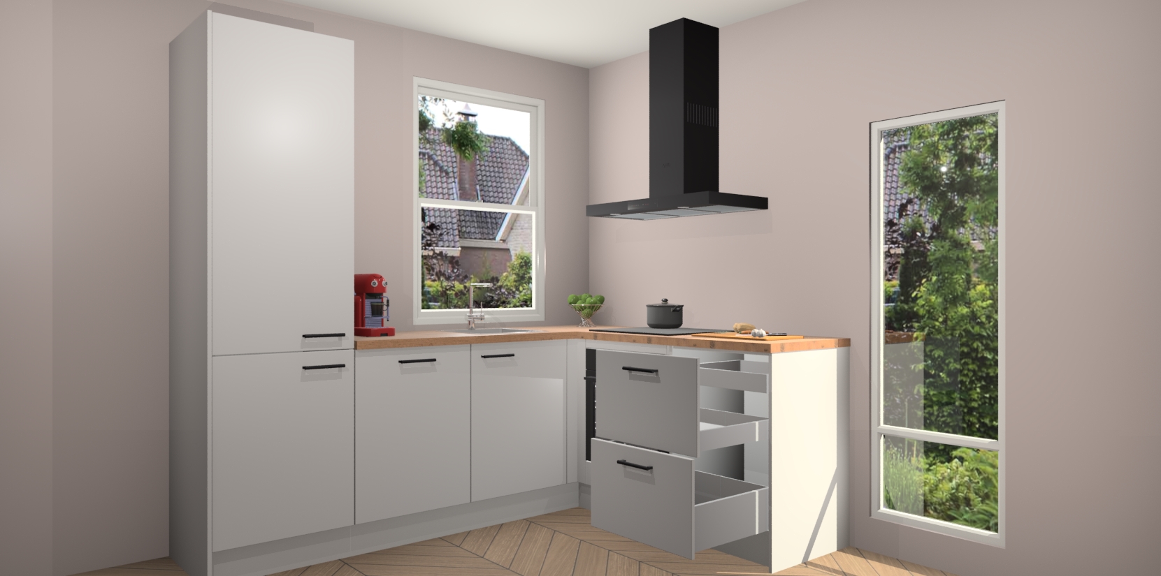 De prachtige Zijdegrijze keuken Phuket is de perfecte keuze als u op zoek bent naar een moderne hoekkeuken met alle luxe en comfort die u kunt verwachten! De uitstraling in het houtlook-design draagt bij aan de warme sfeer die u nu al voelt wanneer u er naar kijkt. Heeft u genoeg van ouderwetse keukens? Probeer dan direct deze moderne, mooie hoekkeukens en laat iedereen verbluft achter!