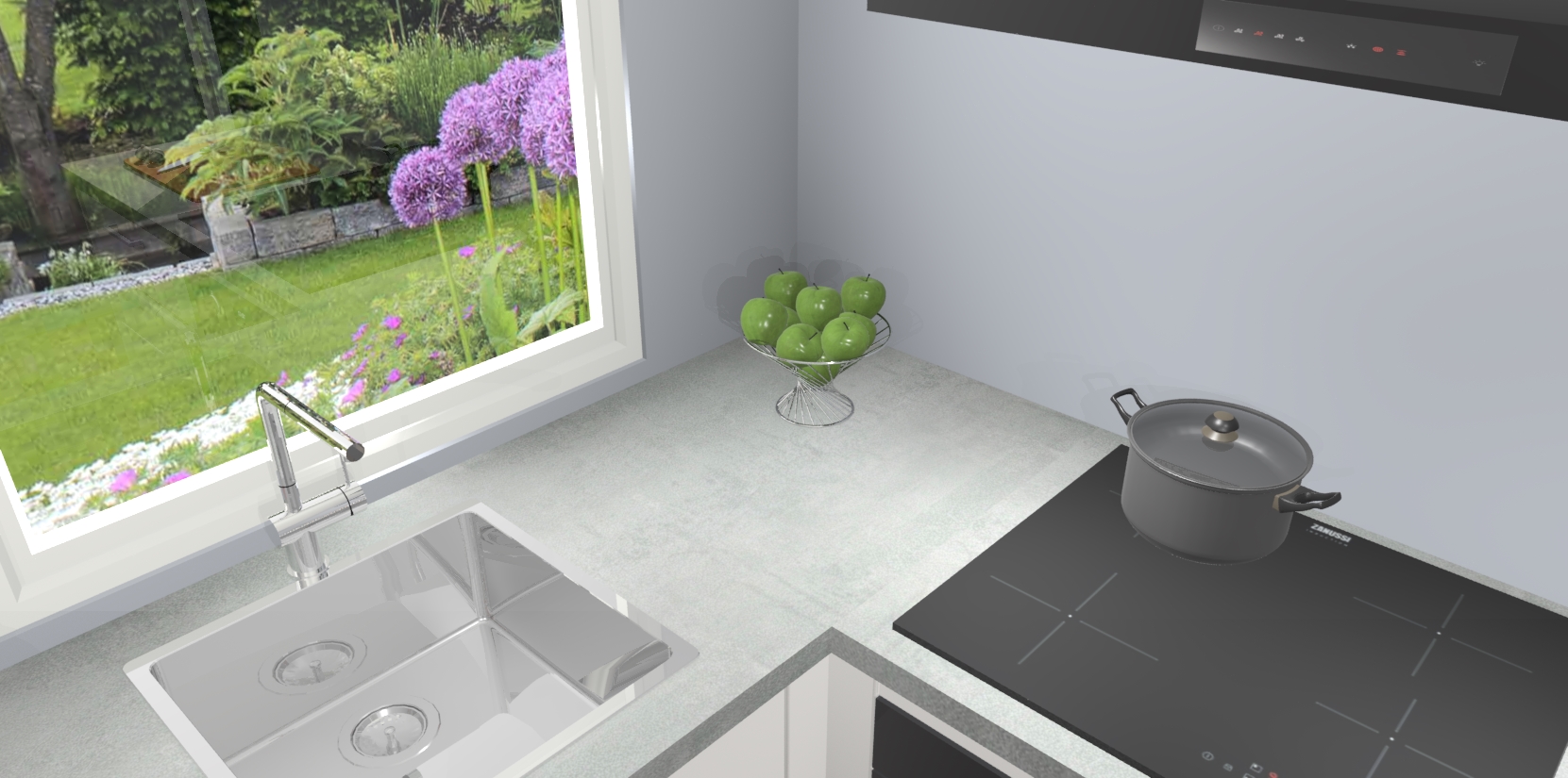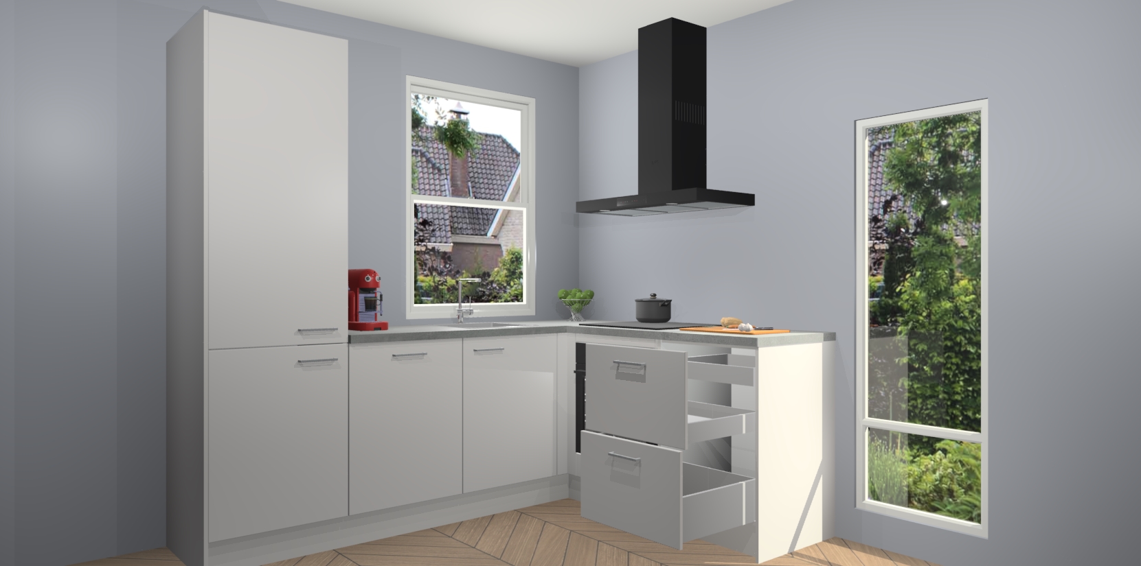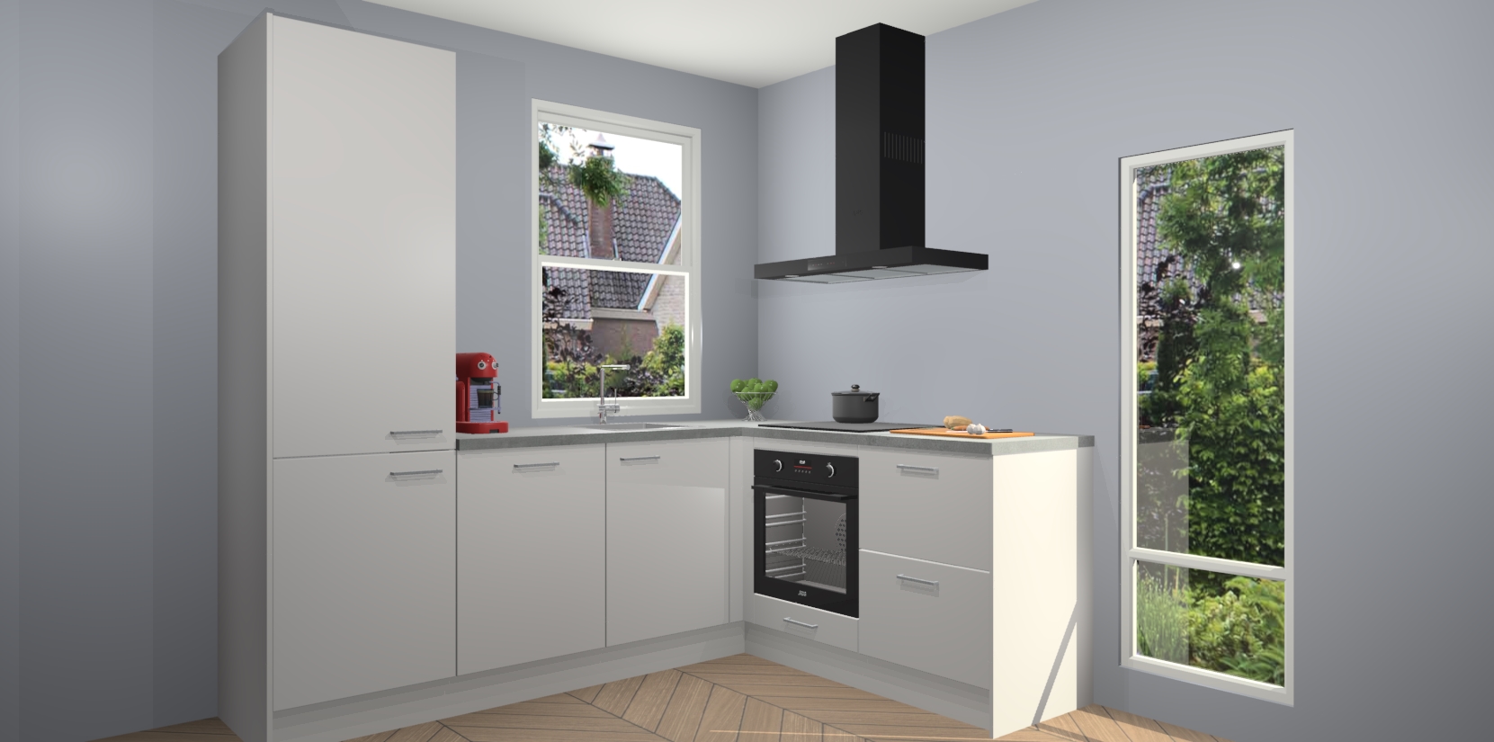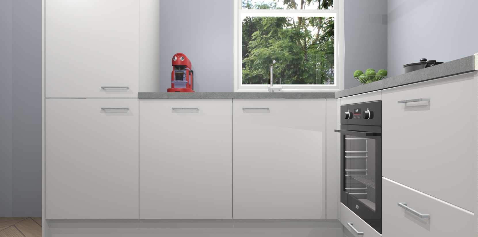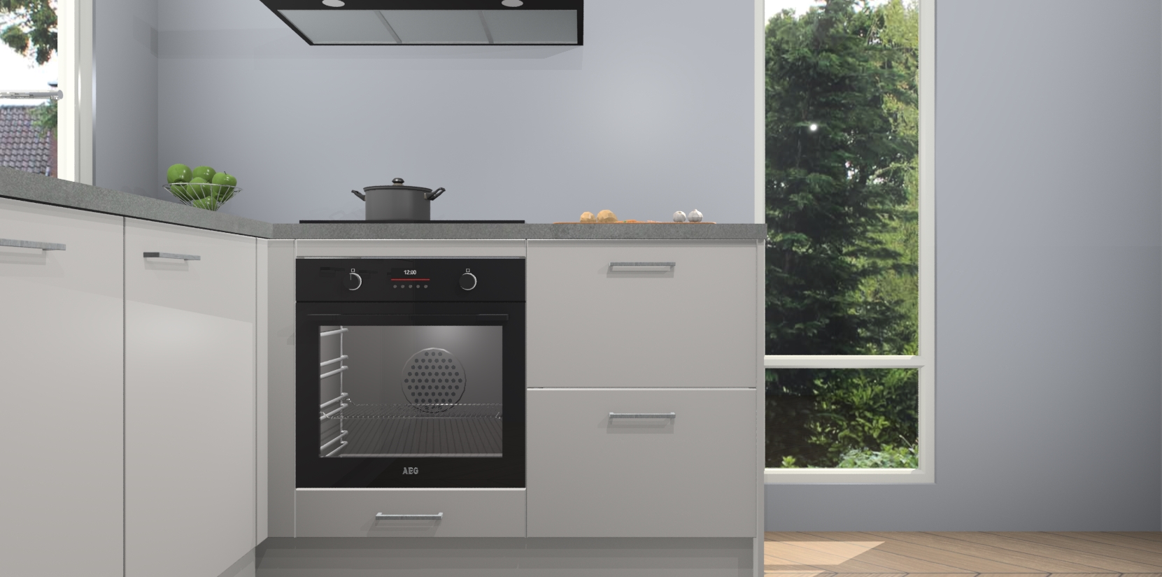 De Zijdegrijze keuken Phuket heeft alles wat u maar kunt wensen. Niet alleen zijn er softclose deuren, maar ook 5 ingebouwde apparaten: een oven, inductiekookplaat, afzuigkap, vaatwasser en koelkast - waarbij u later gemakkelijk naar het AEG merk, van inductiekookplaat naar kookplaat met geïntegreerde afzuiging of van oven naar combimagnetron kunt upgraden. Dat alles tegen een vast laag tarief! Bovendien geeft de Zijdegrijze keuken Phuket supersnelle levering van 7 weken. Echt iets voor u als u er niet op wilt wachten om het resultaat te zien in eigen keuken!