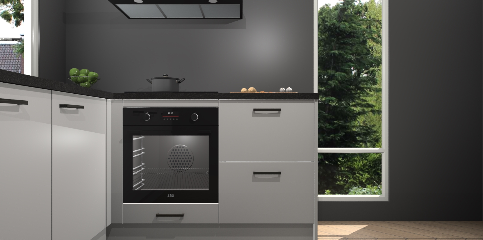 De Zijdegrijze keuken Phuket heeft alles wat u maar kunt wensen. Niet alleen zijn er softclose deuren, maar ook 5 ingebouwde apparaten: een oven, inductiekookplaat, afzuigkap, vaatwasser en koelkast - waarbij u later gemakkelijk naar het AEG merk, van inductiekookplaat naar kookplaat met geïntegreerde afzuiging of van oven naar combimagnetron kunt upgraden. Dat alles tegen een vast laag tarief! Bovendien geeft de Zijdegrijze keuken Phuket supersnelle levering van 7 weken. Echt iets voor u als u er niet op wilt wachten om het resultaat te zien in eigen keuken!