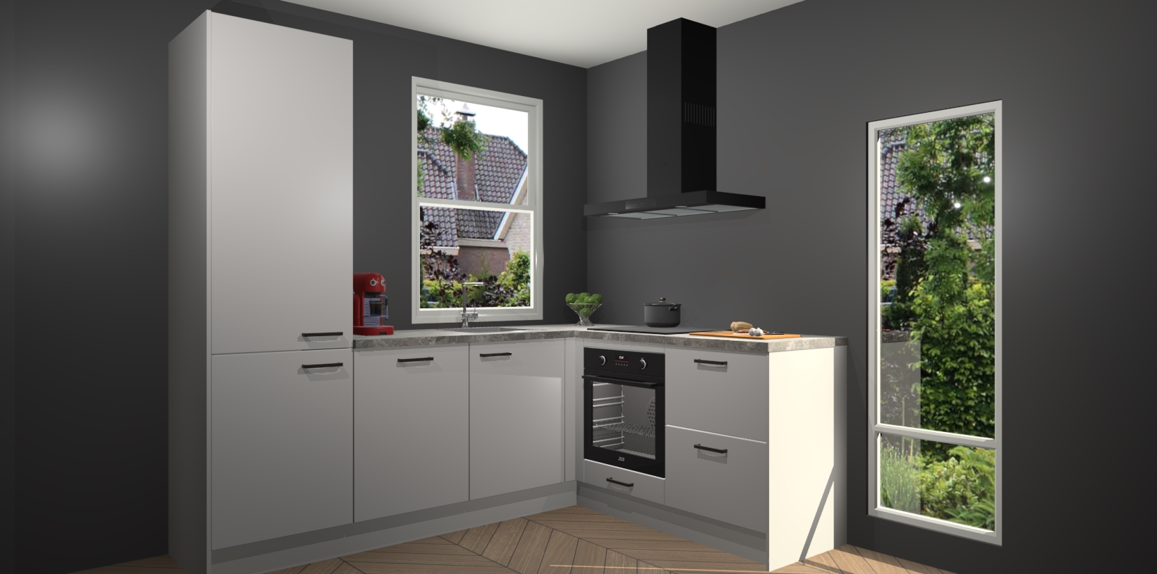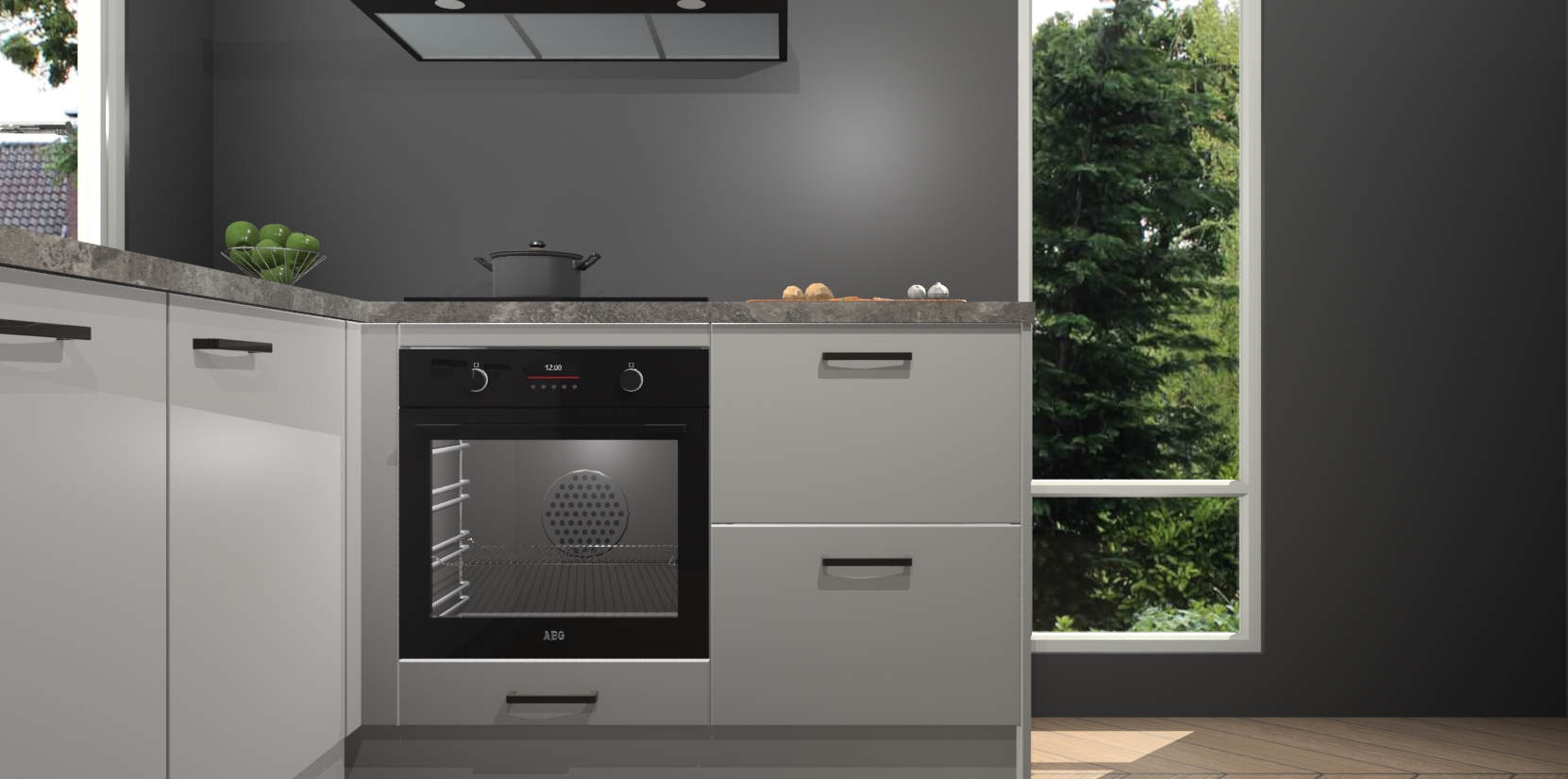 De Zijdegrijze keuken Phuket heeft alles wat u maar kunt wensen. Niet alleen zijn er softclose deuren, maar ook 5 ingebouwde apparaten: een oven, inductiekookplaat, afzuigkap, vaatwasser en koelkast - waarbij u later gemakkelijk naar het AEG merk, van inductiekookplaat naar kookplaat met geïntegreerde afzuiging of van oven naar combimagnetron kunt upgraden. Dat alles tegen een vast laag tarief! Bovendien geeft de Zijdegrijze keuken Phuket supersnelle levering van 7 weken. Echt iets voor u als u er niet op wilt wachten om het resultaat te zien in eigen keuken!