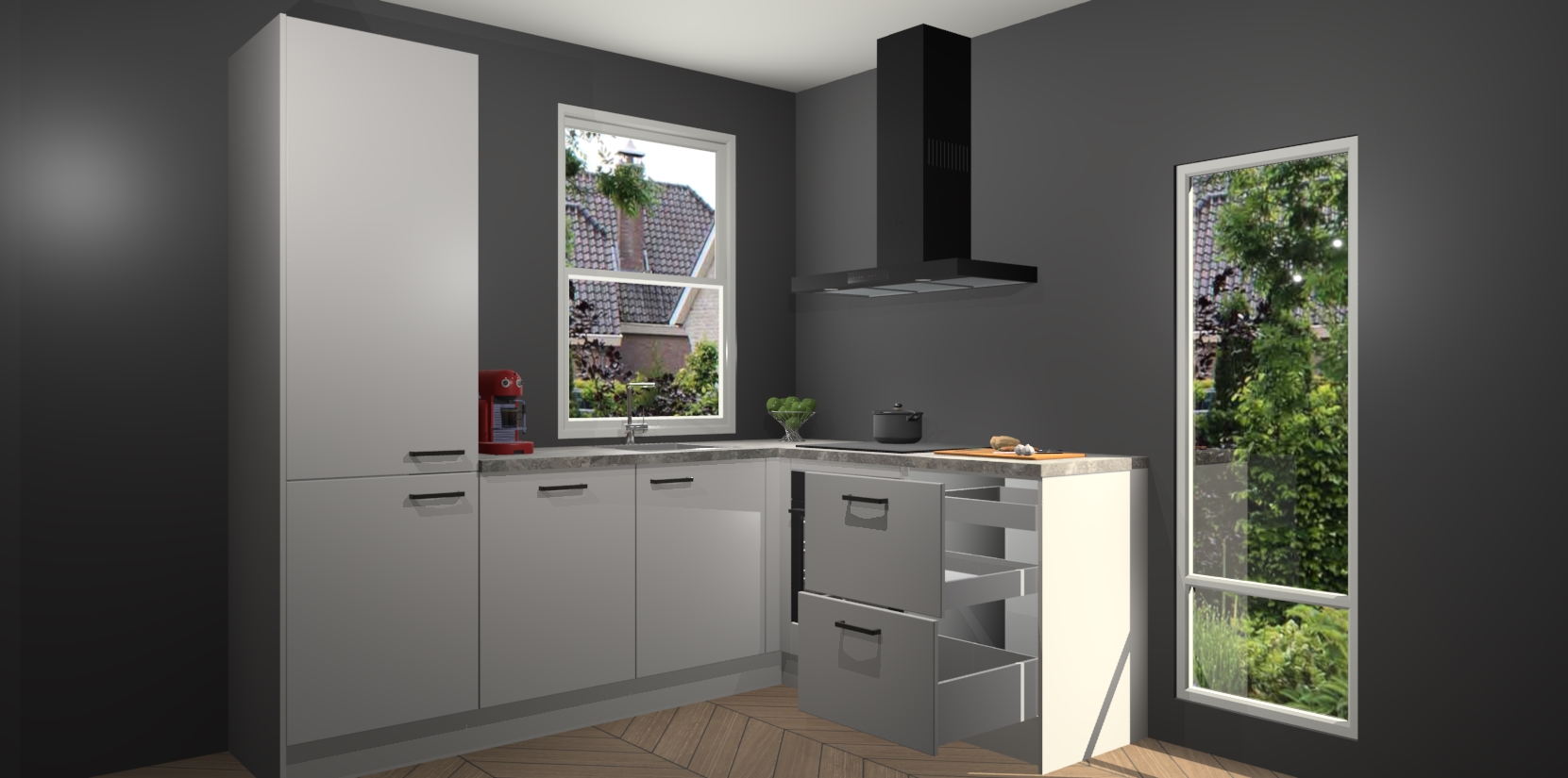 De prachtige Zijdegrijze keuken Phuket is de perfecte keuze als u op zoek bent naar een moderne hoekkeuken met alle luxe en comfort die u kunt verwachten! De uitstraling in het houtlook-design draagt bij aan de warme sfeer die u nu al voelt wanneer u er naar kijkt. Heeft u genoeg van ouderwetse keukens? Probeer dan direct deze moderne, mooie hoekkeukens en laat iedereen verbluft achter!