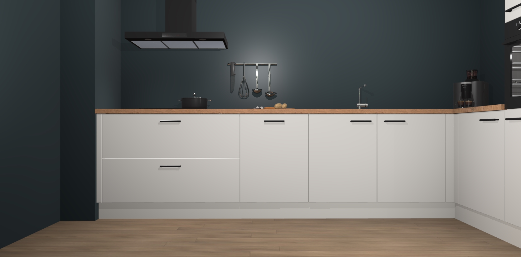 Welkom bij de Zijdegrijze keuken Portland. Deze prachtige keuken zal de komende jaren het middelpunt van de belangstelling in uw huis zijn. Uitgerust met vijf inbouwapparaten komt u nooit kookgereedschap tekort. Bovendien geeft de warme houtlook elke ruimte een uitnodigende en tijdloze uitstraling.