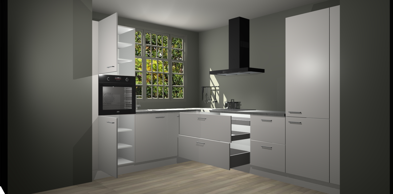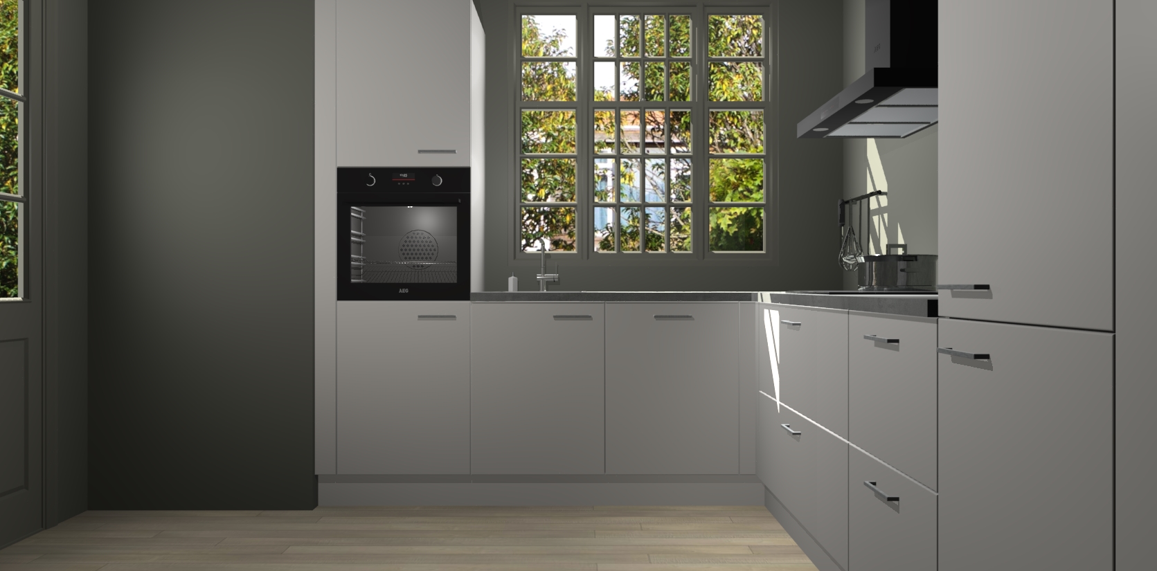 Met een modern, tijdloos design en ruime opslagruimte, zult u zich in no-time thuis voelen in uw nieuwe keuken. Uw leven wordt eenvoudiger met de soft-close deuren die voor het ultieme stille comfort zorgen - geen geluid dat u stoort terwijl u kookt. Ook is de keuken voorzien van 5 ingebouwde apparaten: een oven, inductie kookplaat, afzuigkap, vaatwasser en koelkast. Deze kunnen gemakkelijk na bestelling worden bijgewerkt naar AEG - waardoor uw luxe ervaring compleet is.