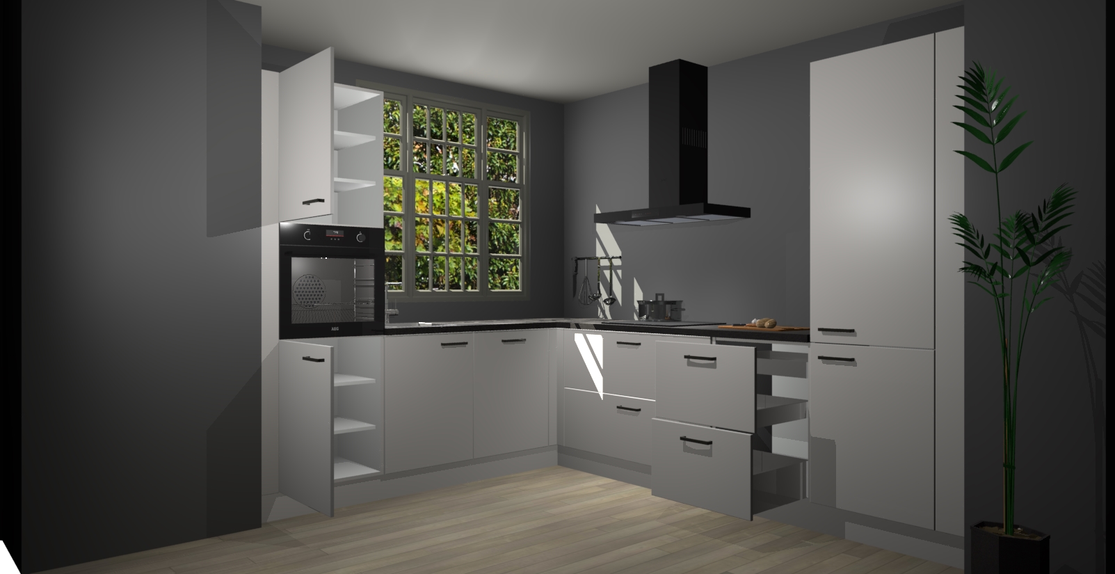 Met een modern, tijdloos design en ruime opslagruimte, zult u zich in no-time thuis voelen in uw nieuwe keuken. Uw leven wordt eenvoudiger met de soft-close deuren die voor het ultieme stille comfort zorgen - geen geluid dat u stoort terwijl u kookt. Ook is de keuken voorzien van 5 ingebouwde apparaten: een oven, inductie kookplaat, afzuigkap, vaatwasser en koelkast. Deze kunnen gemakkelijk na bestelling worden bijgewerkt naar AEG - waardoor uw luxe ervaring compleet is.