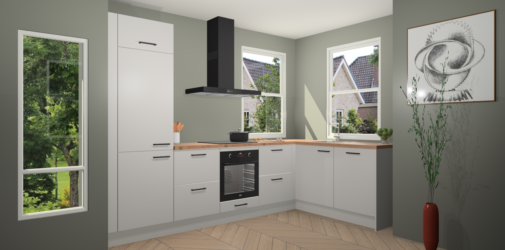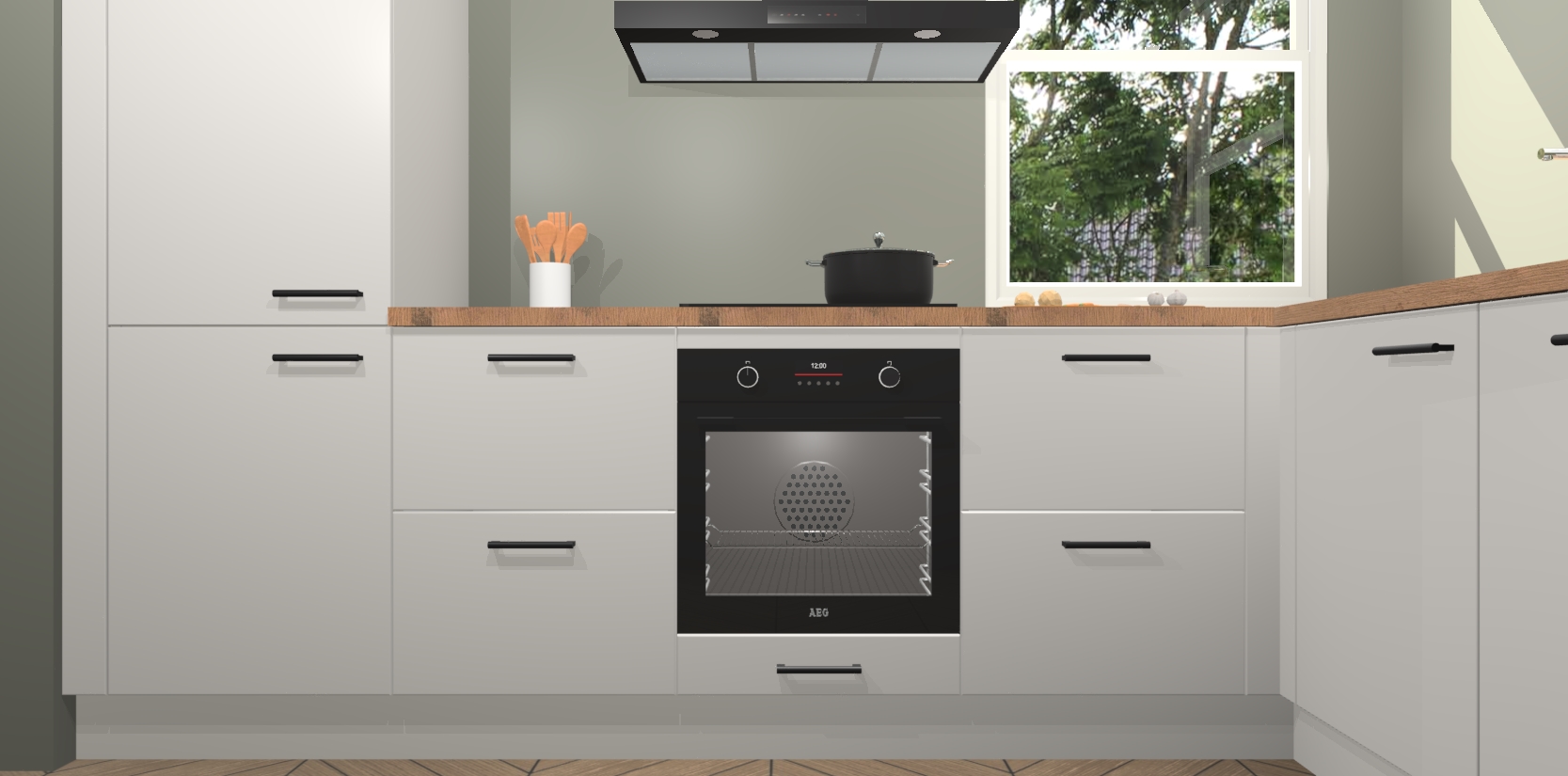Wat maakt deze keuken zo bijzonder? Ten eerste geeft het houten werkblad uw ruimte een onmiskenbaar klassieke uitstraling. De natuurlijke afwerking roept warmte en elegantie op die nooit uit de mode zullen raken. Bovendien is het gemakkelijk schoon te houden en te onderhouden, zodat je er jarenlang plezier van kunt hebben. Als u op zoek bent naar extra gemak in uw keuken, dan heeft u bij het plaatsen van een bestelling bij ons ook de optie om uw toestellen te upgraden naar AEG-modellen - zo haalt u moderne innovatie van topmerken in apparatentechnologie rechtstreeks in huis.