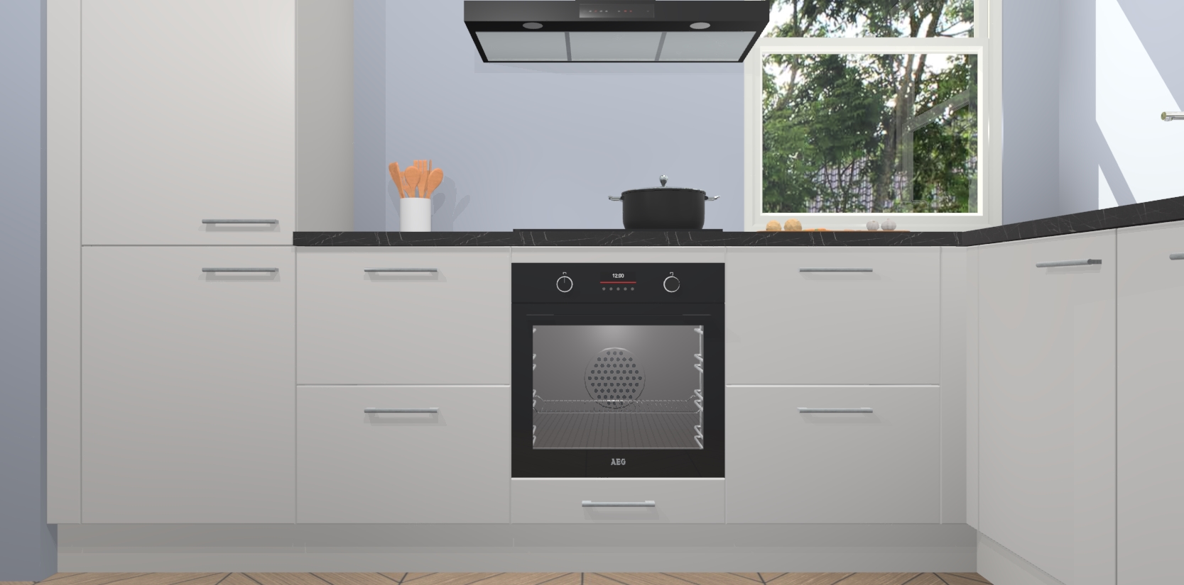 Wat maakt deze keuken zo bijzonder? Ten eerste geeft het houten werkblad uw ruimte een onmiskenbaar klassieke uitstraling. De natuurlijke afwerking roept warmte en elegantie op die nooit uit de mode zullen raken. Bovendien is het gemakkelijk schoon te houden en te onderhouden, zodat je er jarenlang plezier van kunt hebben. Als u op zoek bent naar extra gemak in uw keuken, dan heeft u bij het plaatsen van een bestelling bij ons ook de optie om uw toestellen te upgraden naar AEG-modellen - zo haalt u moderne innovatie van topmerken in apparatentechnologie rechtstreeks in huis.