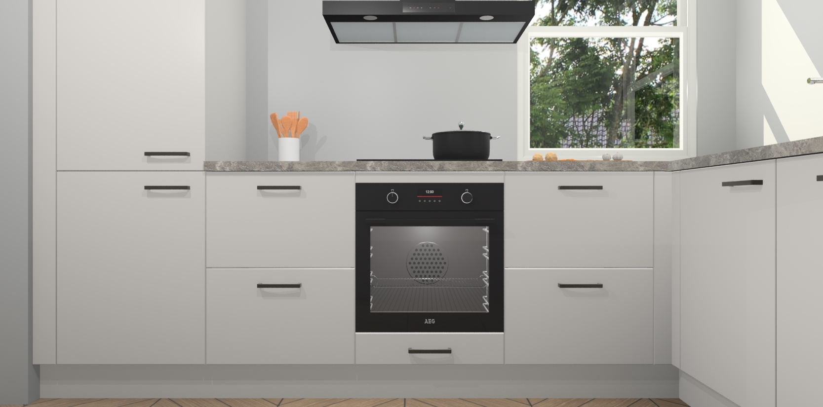 Wat maakt deze keuken zo bijzonder? Ten eerste geeft het houten werkblad uw ruimte een onmiskenbaar klassieke uitstraling. De natuurlijke afwerking roept warmte en elegantie op die nooit uit de mode zullen raken. Bovendien is het gemakkelijk schoon te houden en te onderhouden, zodat je er jarenlang plezier van kunt hebben. Als u op zoek bent naar extra gemak in uw keuken, dan heeft u bij het plaatsen van een bestelling bij ons ook de optie om uw toestellen te upgraden naar AEG-modellen - zo haalt u moderne innovatie van topmerken in apparatentechnologie rechtstreeks in huis.