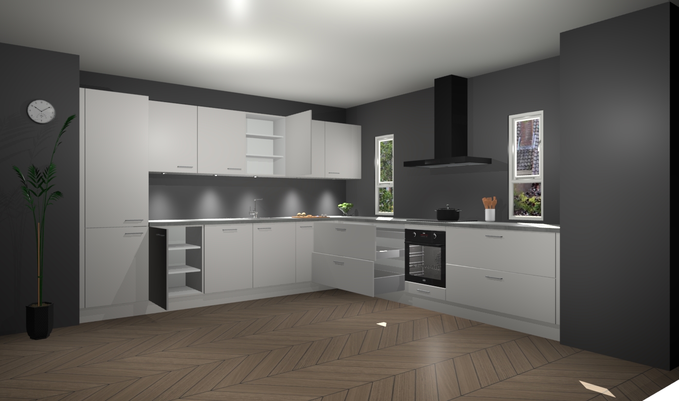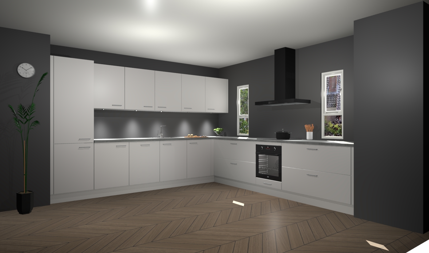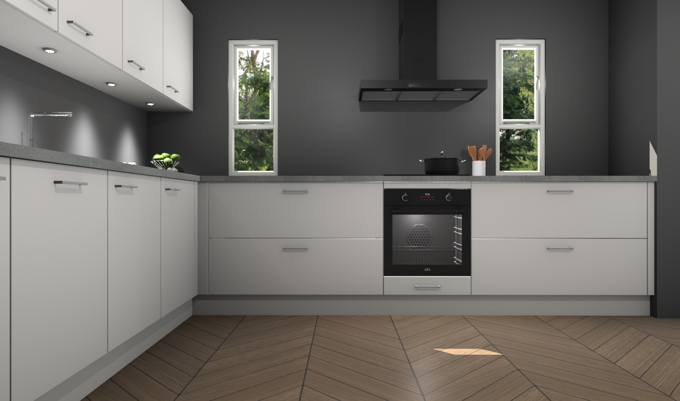 De zijdegrijze keuken is een ideale hoekkeuken en heeft alle functies en apparatuur die u maar nodig kunt hebben. Bij de bestelling krijgt u een oven, inductiekookplaat, afzuigkap, vaatwasser en koelkast - deze kunnen desgewenst eenvoudig worden uitgebreid naar AEG na bestellen. Elke kast wordt ook voor gemonteerd geleverd met soft close deuren die jarenlang gebruik beloven. Stelt u zich voor dat u geen gedoe heeft met vervelende montage - vanaf het moment dat u uw bestelling plaats, duurt het slechts 7 weken voor het bij u thuis geleverd wordt.