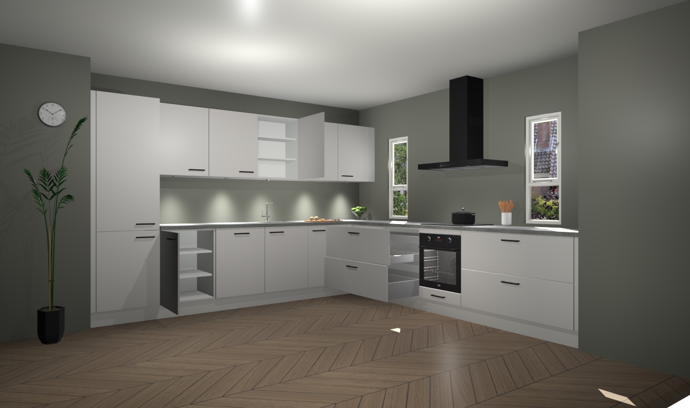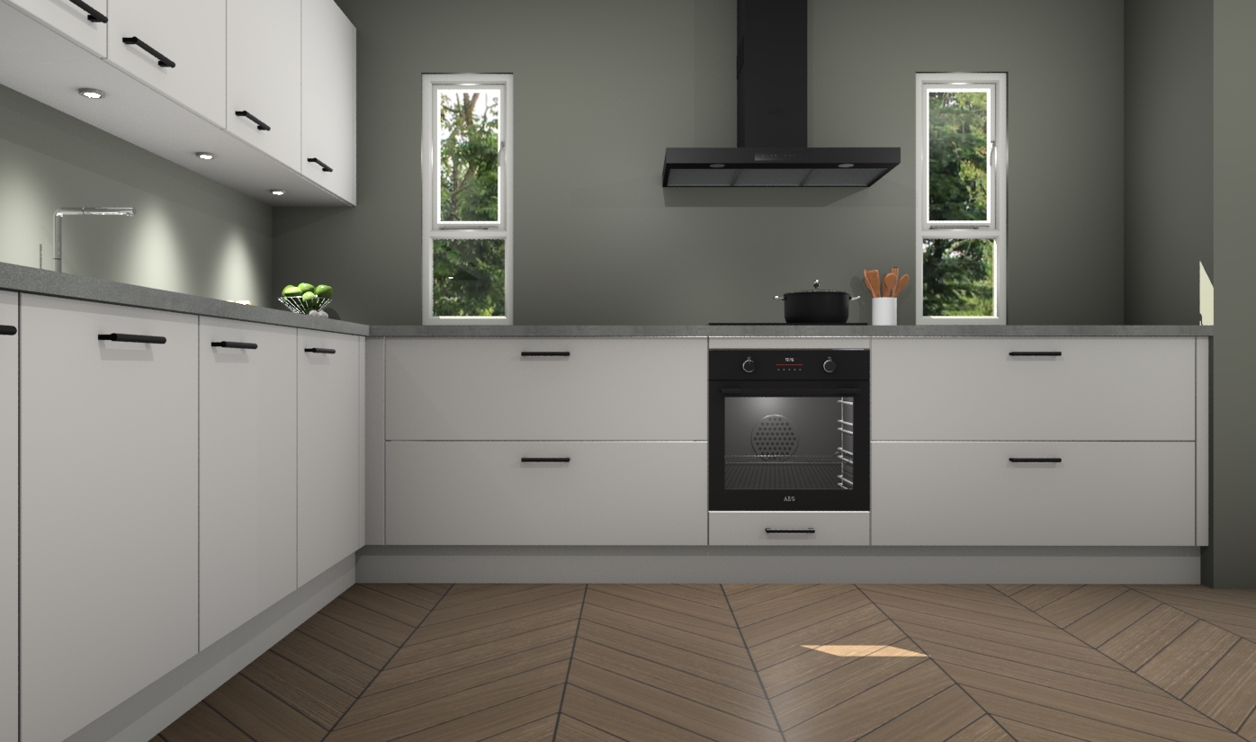 De zijdegrijze keuken is een ideale hoekkeuken en heeft alle functies en apparatuur die u maar nodig kunt hebben. Bij de bestelling krijgt u een oven, inductiekookplaat, afzuigkap, vaatwasser en koelkast - deze kunnen desgewenst eenvoudig worden uitgebreid naar AEG na bestellen. Elke kast wordt ook voor gemonteerd geleverd met soft close deuren die jarenlang gebruik beloven. Stelt u zich voor dat u geen gedoe heeft met vervelende montage - vanaf het moment dat u uw bestelling plaats, duurt het slechts 7 weken voor het bij u thuis geleverd wordt.