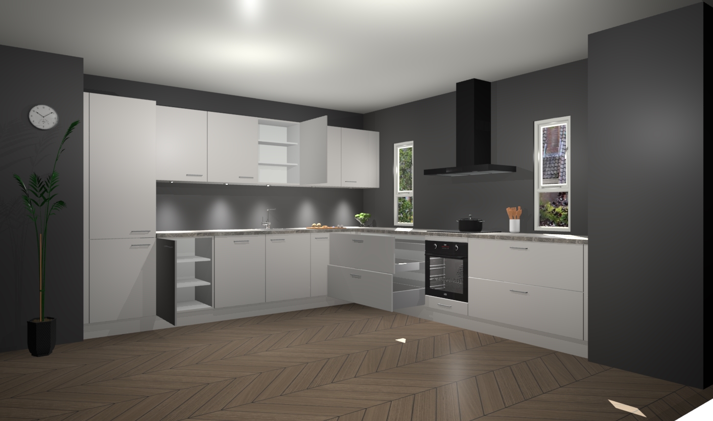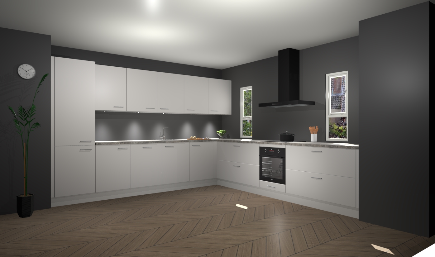 De zijdegrijze keuken is een ideale hoekkeuken en heeft alle functies en apparatuur die u maar nodig kunt hebben. Bij de bestelling krijgt u een oven, inductiekookplaat, afzuigkap, vaatwasser en koelkast - deze kunnen desgewenst eenvoudig worden uitgebreid naar AEG na bestellen. Elke kast wordt ook voor gemonteerd geleverd met soft close deuren die jarenlang gebruik beloven. Stelt u zich voor dat u geen gedoe heeft met vervelende montage - vanaf het moment dat u uw bestelling plaats, duurt het slechts 7 weken voor het bij u thuis geleverd wordt.