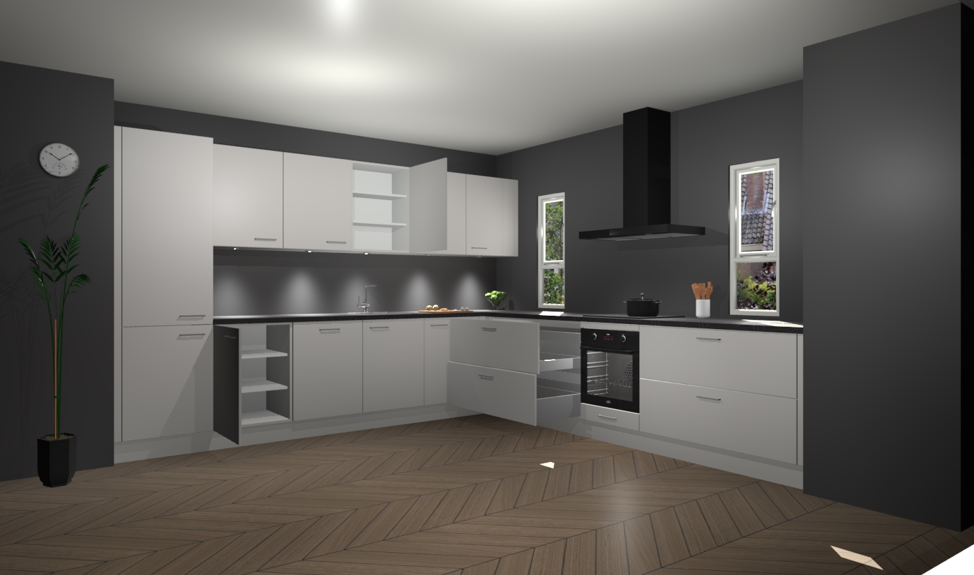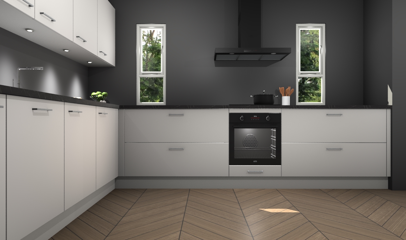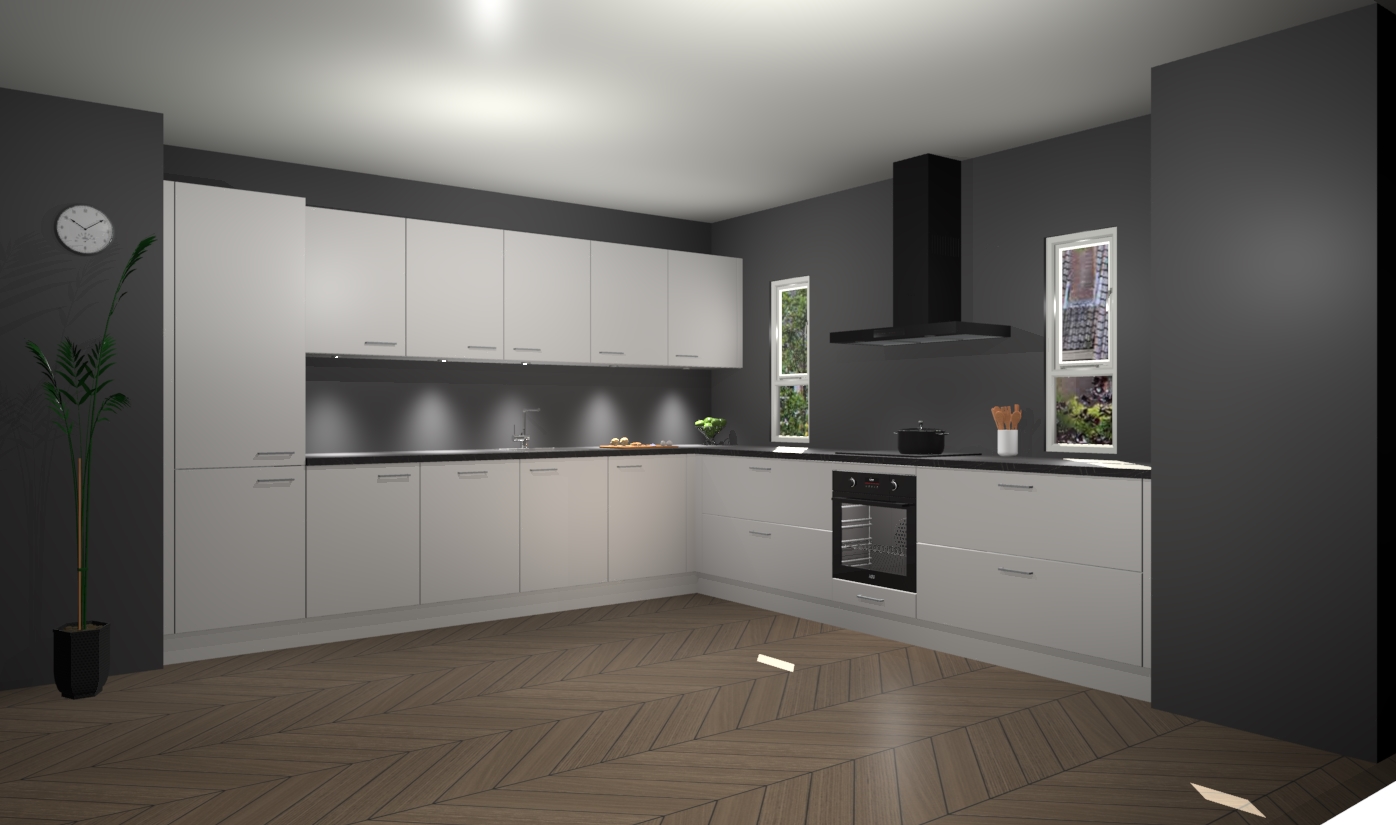 De zijdegrijze keuken is een ideale hoekkeuken en heeft alle functies en apparatuur die u maar nodig kunt hebben. Bij de bestelling krijgt u een oven, inductiekookplaat, afzuigkap, vaatwasser en koelkast - deze kunnen desgewenst eenvoudig worden uitgebreid naar AEG na bestellen. Elke kast wordt ook voor gemonteerd geleverd met soft close deuren die jarenlang gebruik beloven. Stelt u zich voor dat u geen gedoe heeft met vervelende montage - vanaf het moment dat u uw bestelling plaats, duurt het slechts 7 weken voor het bij u thuis geleverd wordt.
