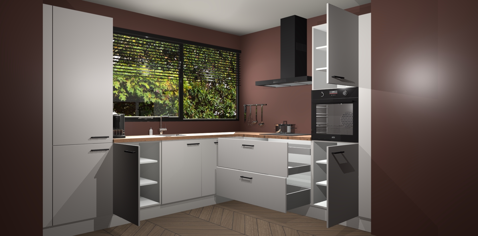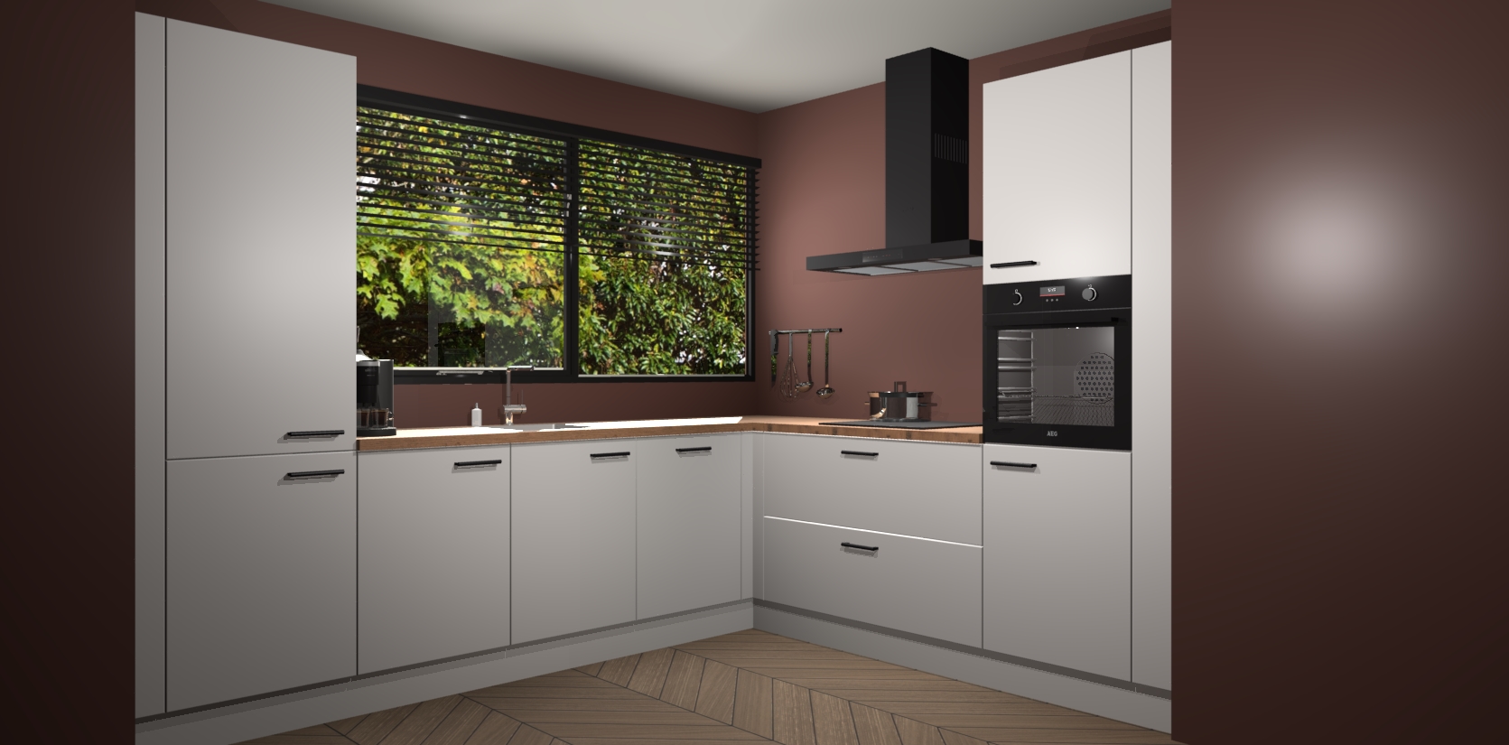 Met een modern, tijdloos design en ruime opslagruimte, zult u zich in no-time thuis voelen in uw nieuwe keuken. Uw leven wordt eenvoudiger met de soft-close deuren die voor het ultieme stille comfort zorgen - geen geluid dat u stoort terwijl u kookt. Ook is de keuken voorzien van 5 ingebouwde apparaten: een oven, inductie kookplaat, afzuigkap, vaatwasser en koelkast. Deze kunnen gemakkelijk na bestelling worden bijgewerkt naar AEG - waardoor uw luxe ervaring compleet is.