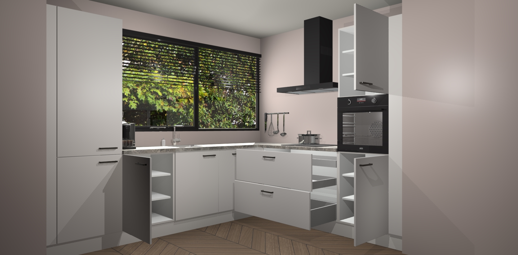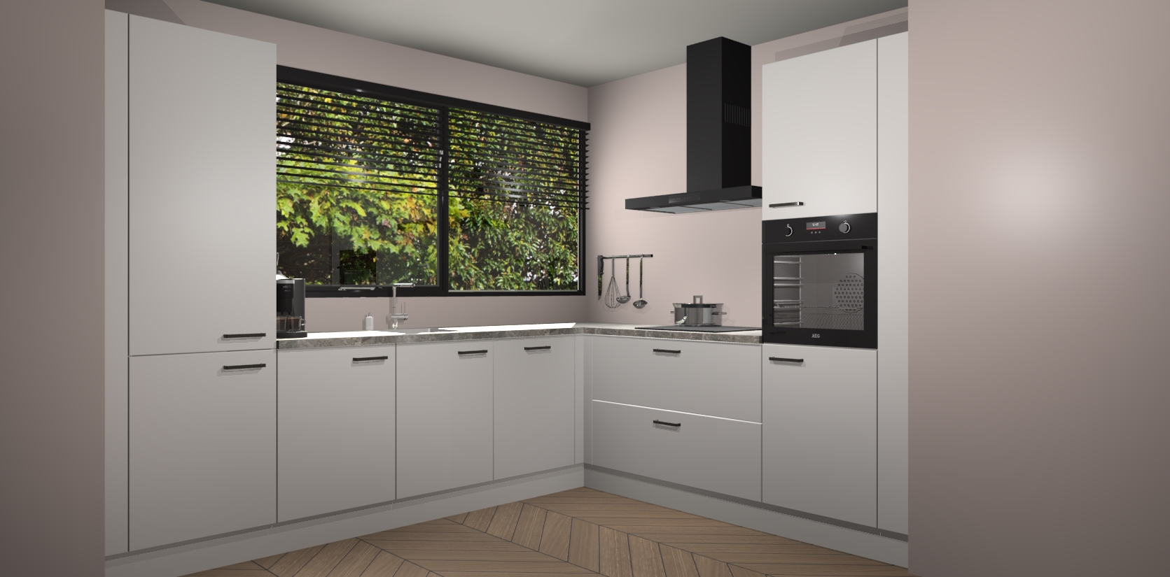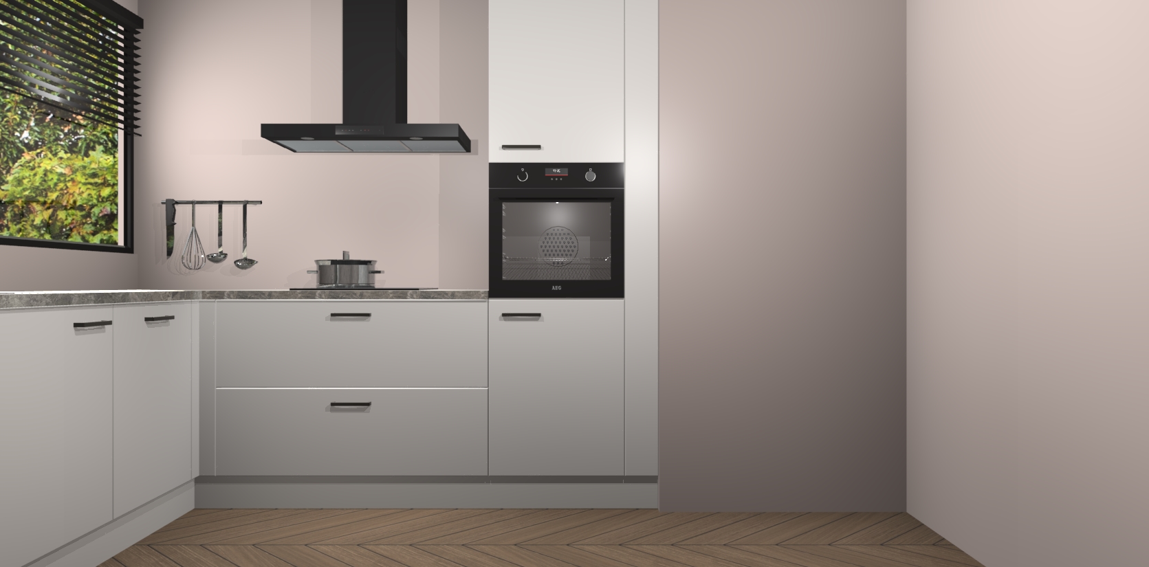 Met een modern, tijdloos design en ruime opslagruimte, zult u zich in no-time thuis voelen in uw nieuwe keuken. Uw leven wordt eenvoudiger met de soft-close deuren die voor het ultieme stille comfort zorgen - geen geluid dat u stoort terwijl u kookt. Ook is de keuken voorzien van 5 ingebouwde apparaten: een oven, inductie kookplaat, afzuigkap, vaatwasser en koelkast. Deze kunnen gemakkelijk na bestelling worden bijgewerkt naar AEG - waardoor uw luxe ervaring compleet is.