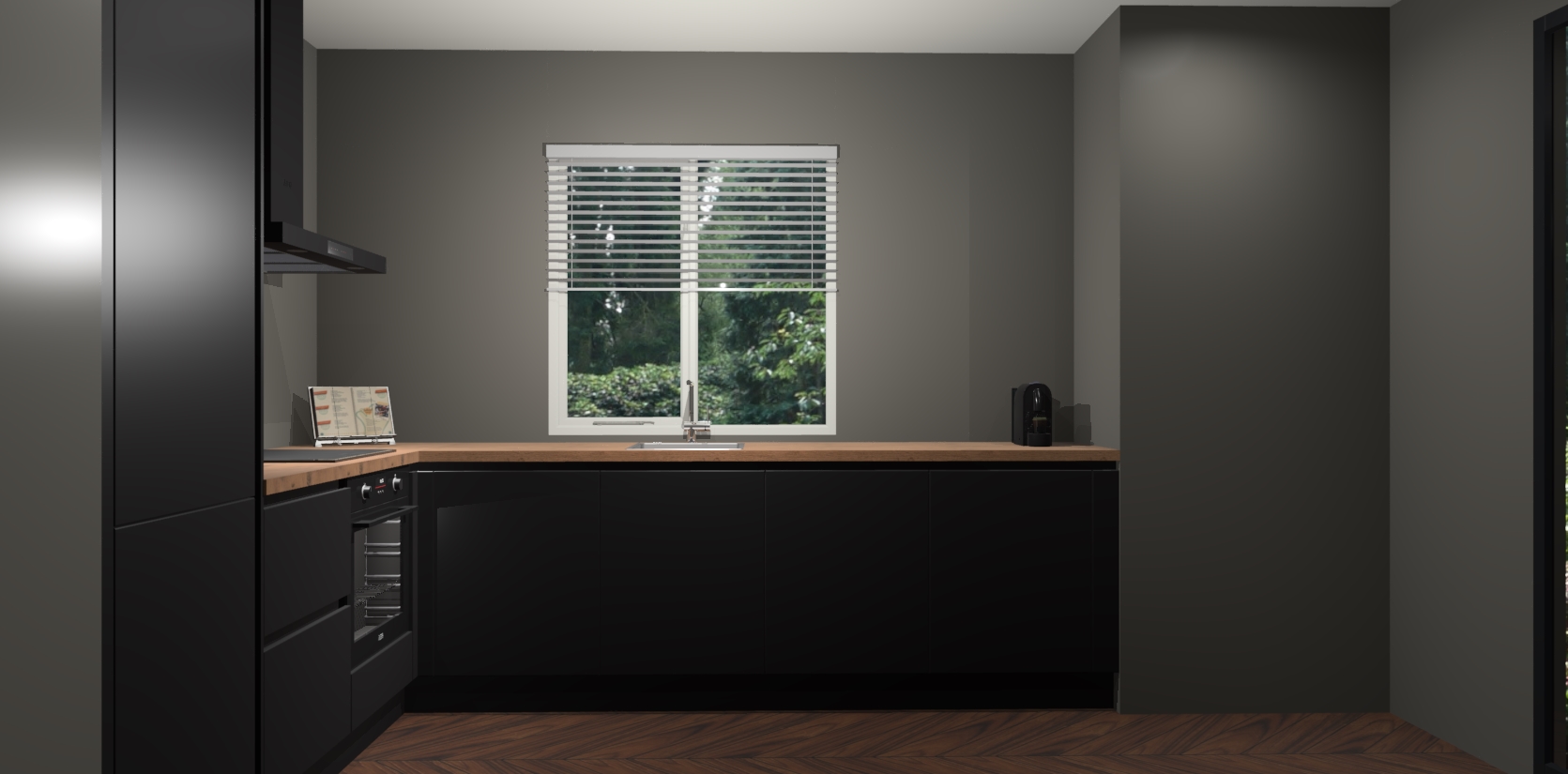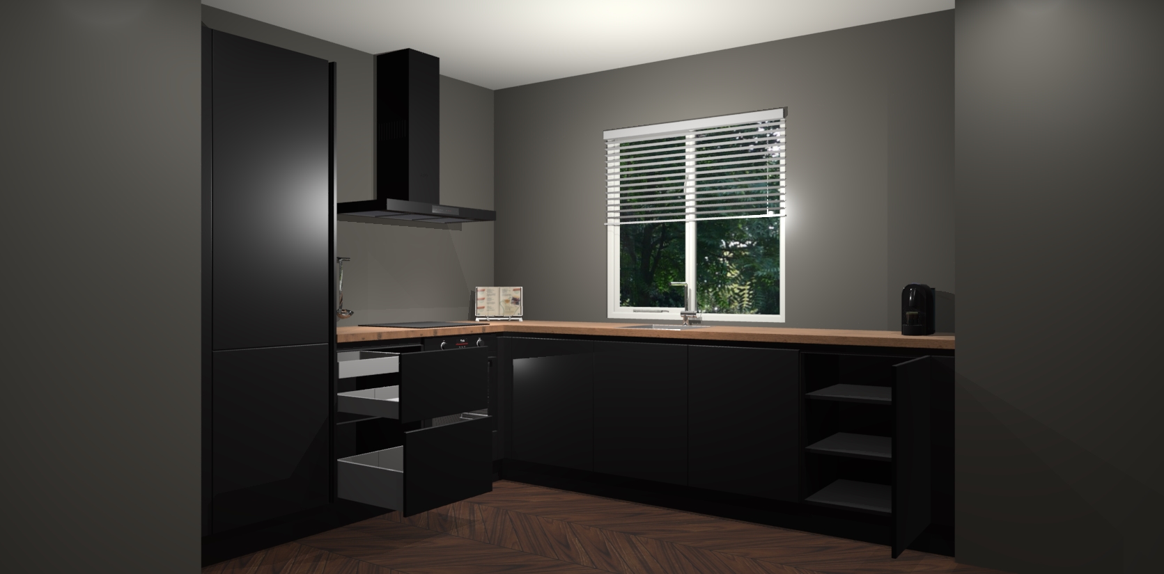 Met de Zwart keuken Doha Maakt u van uw keuken het pronkstuk van uw huis. Stijlvol en toch praktisch, de nieuwste look voor wie meer waarde en charme aan zijn huis wil toevoegen. Met prachtige zwarte handgrepen die zich lenen voor een klassieke stijlbron, zal u niet teleurgesteld zijn in het resultaat. De soft-close deurscharnieren geven een gevoel van luxe omdat ze zachtjes bewegen zonder storende of krakende geluiden te veroorzaken.