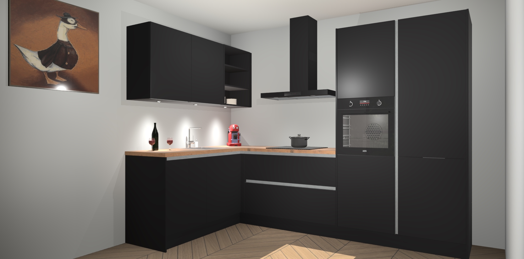 De Zwarte greeploze keuken Cognac is een adembenemend ontwerp met een modern en tijdloos uiterlijk. Deze luxe keuken straalt echt aristocratisch uit, waardoor uw koken plezieriger zal worden! Het prachtige design begint bij de hoekkeuken, wat perfect past bij elk type interieur. Bovendien bevat deze hoogwaardige set vijf inbouwapparaten - van oven tot koelkast - die via bestelling naar AEG geüpgraded kunnen worden!
