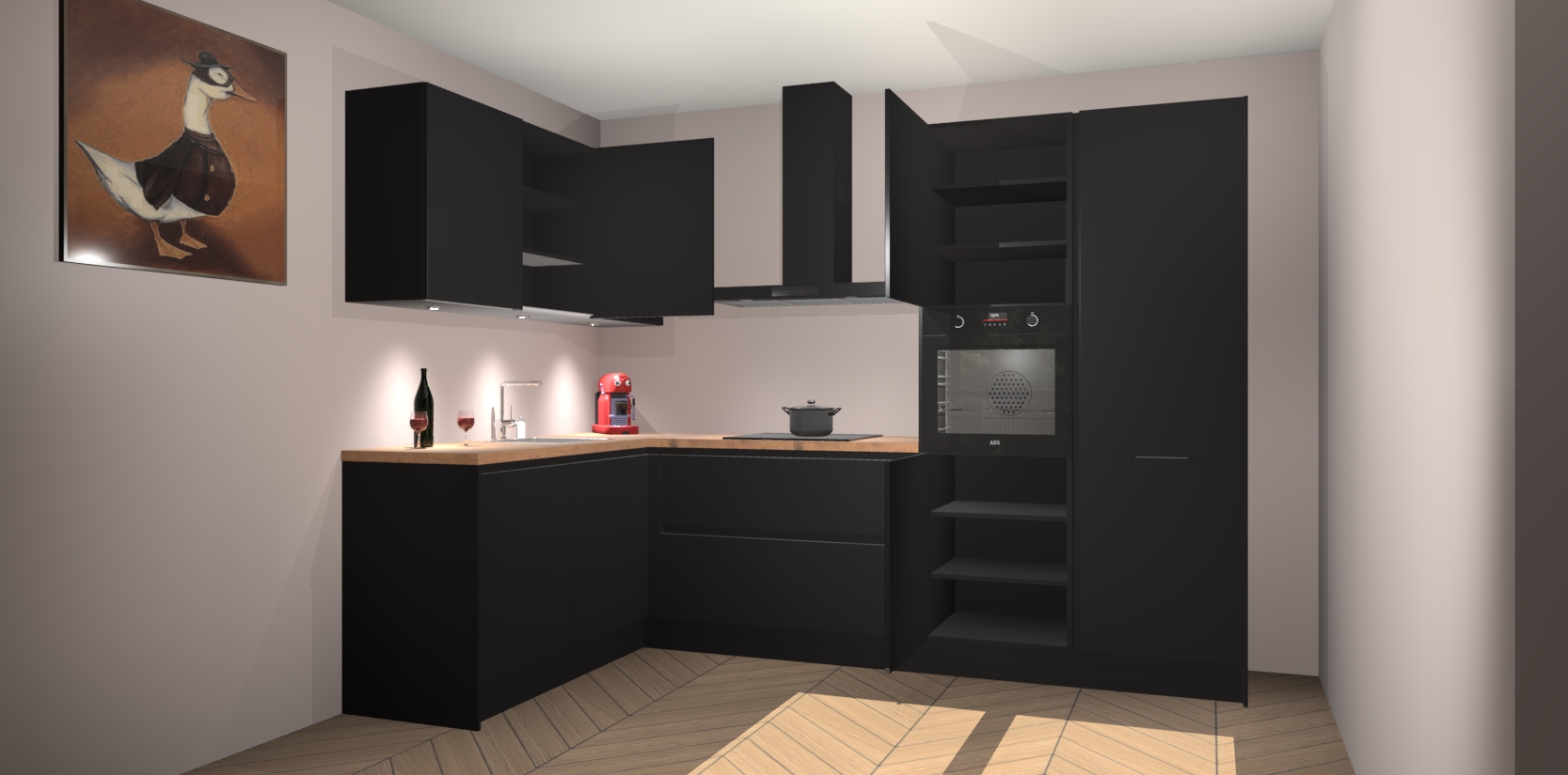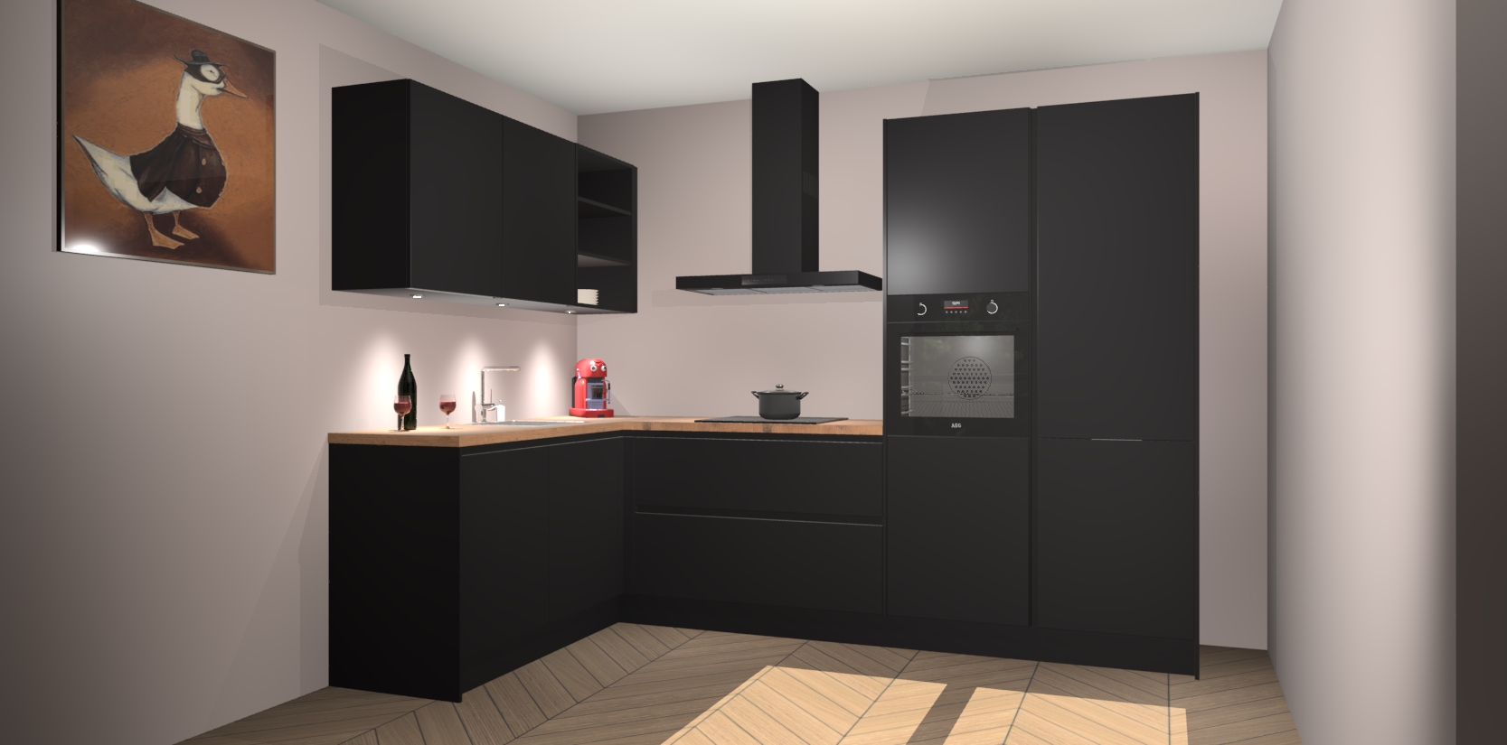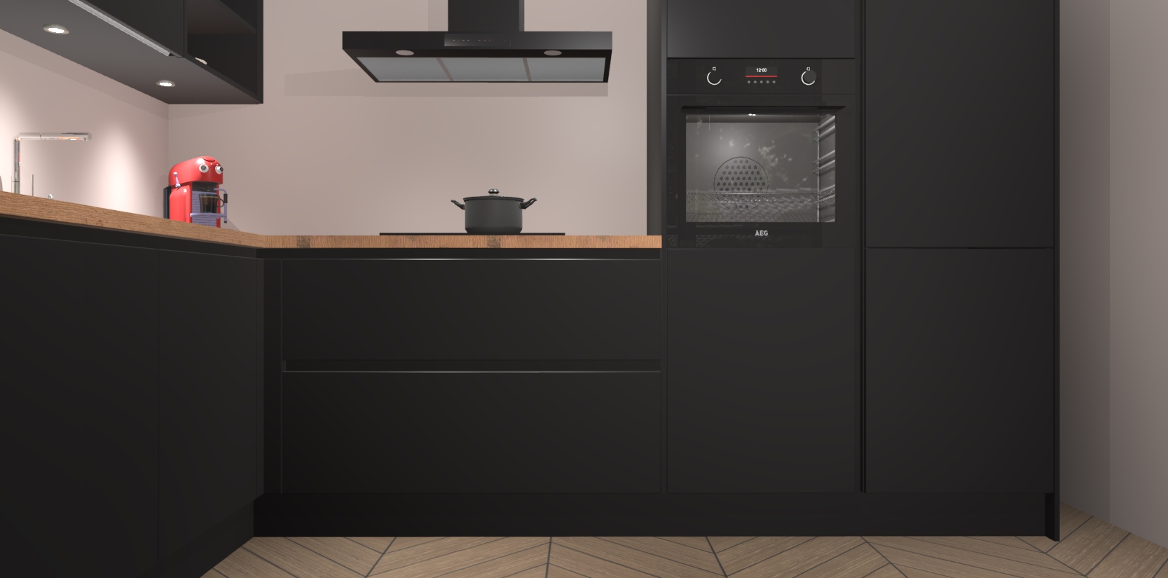 De Zwarte greeploze keuken Cognac is een adembenemend ontwerp met een modern en tijdloos uiterlijk. Deze luxe keuken straalt echt aristocratisch uit, waardoor uw koken plezieriger zal worden! Het prachtige design begint bij de hoekkeuken, wat perfect past bij elk type interieur. Bovendien bevat deze hoogwaardige set vijf inbouwapparaten - van oven tot koelkast - die via bestelling naar AEG geüpgraded kunnen worden!